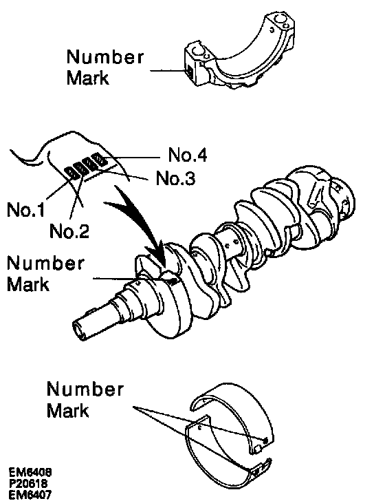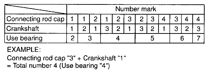 If the number of the bearing cannot be determined, select the correct bearing by adding together the numbers imprinted on the connecting rod cap and crankshaft, then selecting the bearing with the same number as the total. There are six sizes of standard bearings. marked "2" through "7"
