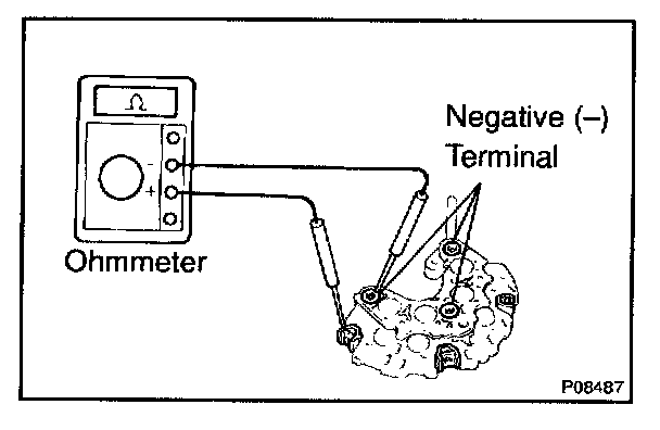 a. Using an ohmmeter, connect one tester probe to each negative (-) terminal and the other to each rectifier terminal.