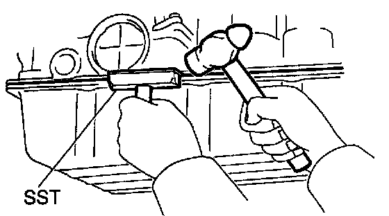 b. Install the blade of SST between the transmission case and oil pan, cut off applied sealer, and remove the oil pan.