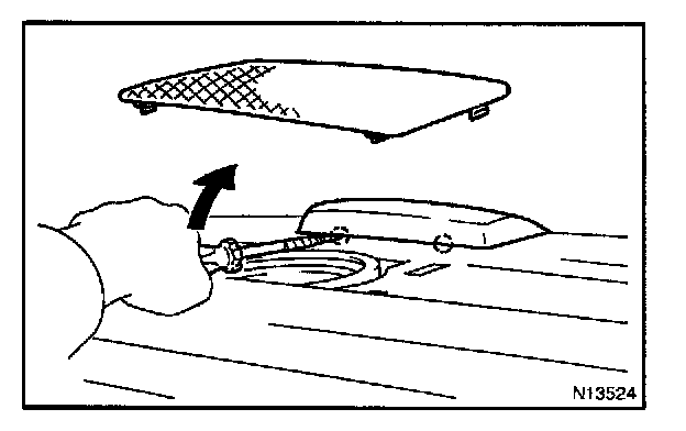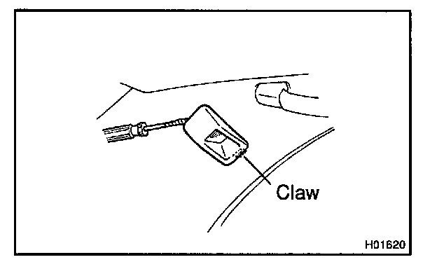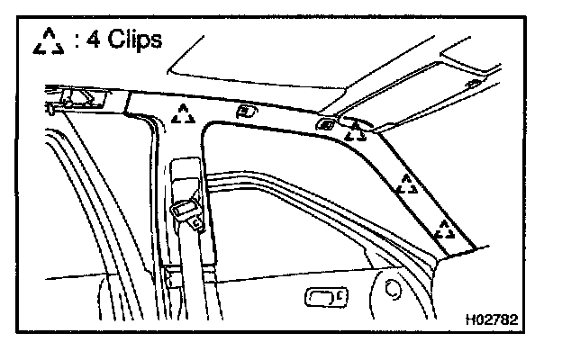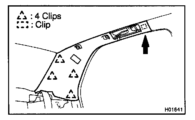 NOTE: Paying enough attention remove the clip on the roof side inner garnish shown in the illustration. Otherwise, the roof side inner garnish or the front pillar garnish might be broken.