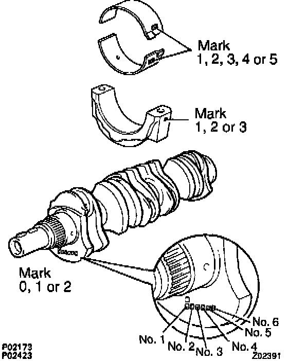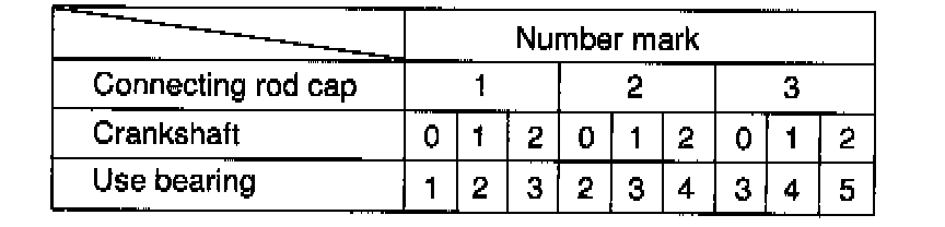If using a standard bearing, replace with one having the same number. If the number of the bearing cannot be determined, select the correct bearing by adding together the numbers imprinted on the connecting rod cap and crankshaft, then selecting the bearing with the same number as the total. There are 5 sizes of standard bearings, marked "1", "2", "3", "4" and "5" accordingly.