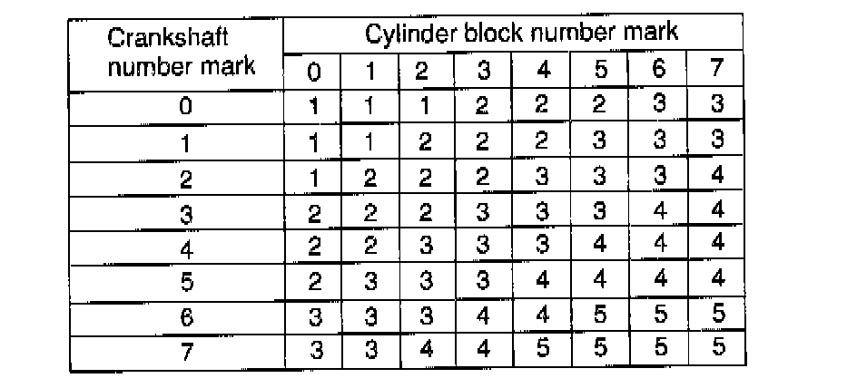 If using a standard bearing, replace with one having the same number. If the number of the bearing cannot be determined, select the correct bearing by adding together the numbers imprinted on the cylinder block and crankshaft, then refer to the table for the appropriate bearing number. There are 5 sizes of standard bearings, marked "1", "2", "3", "4" and "5" accordingly.