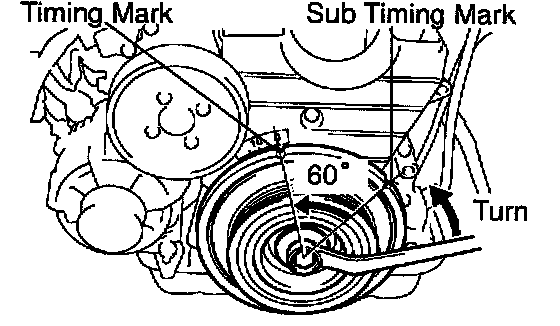 c. Turn the crankshaft pulley 60° counterclockwise to place the sub timing mark (60° mark BTDC) on the crankshaft pulley at the timing mark "0" position of the No. 1 timing belt cover.