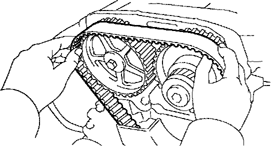 b. Install the timing belt, checking the tension between the crankshaft timing pulley and intake camshaft timing pulley.