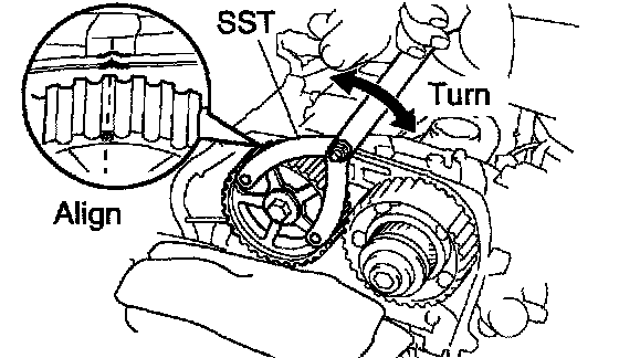 d. Using SST, align the dot mark on the camshaft timing timing pulley with the timing mark of the No.4 timing belt cover.
