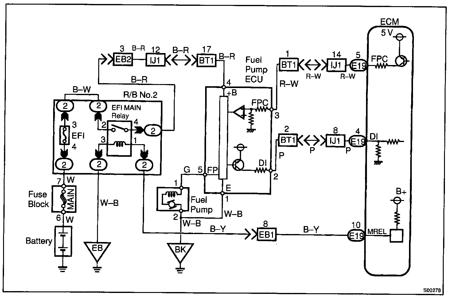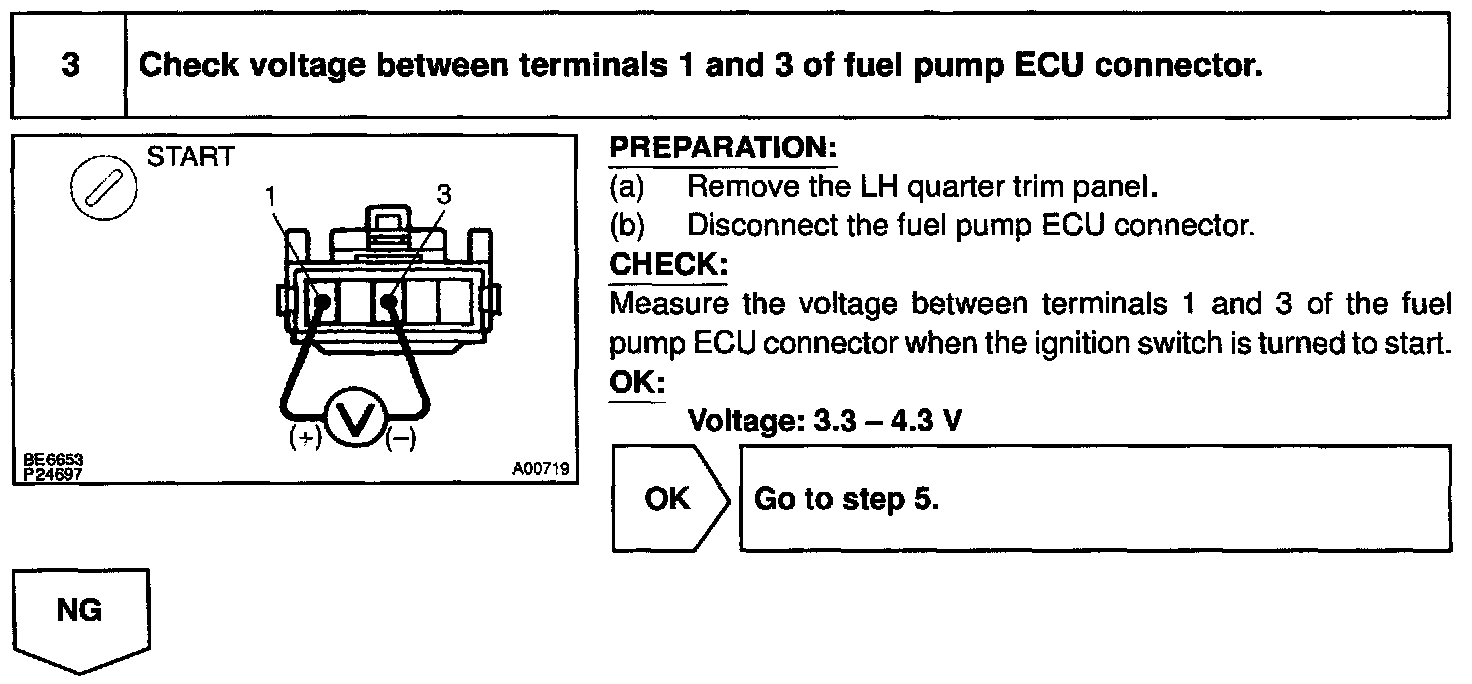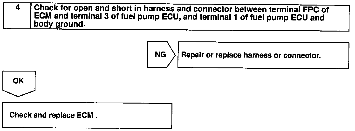 The fuel pump speed is controlled at 2 steps (high speed, low speed) by the condition of the engine (starting, light load, heavy load), when the engine starts (STA ON), the ECM sends a Hi signal (about 5 V) to the fuel pump ECU (FPC terminal).