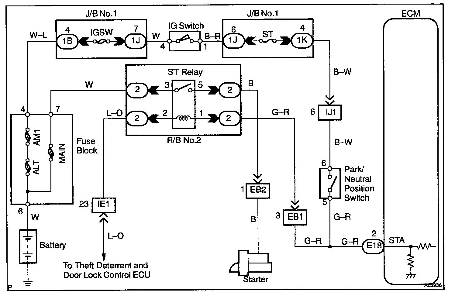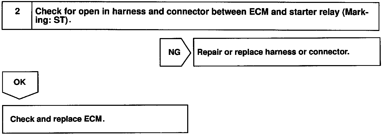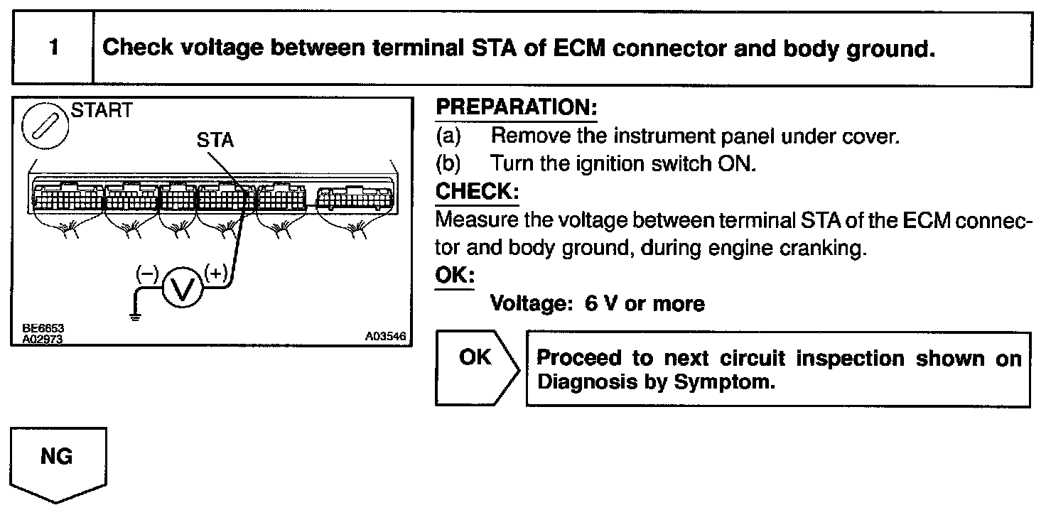 CIRCUIT DESCRIPTIONWhen the engine is cranked, the intake air flow is slow, so fuel vaporization is poor. A rich mixture is therefore necessary in order to achieve good startability. While the engine is being cranked, the battery positive voltage is applied to terminal STA of the ECM. The starter signal is mainly used to increase the fuel injection volume for the starting injection control and after-start injection control.