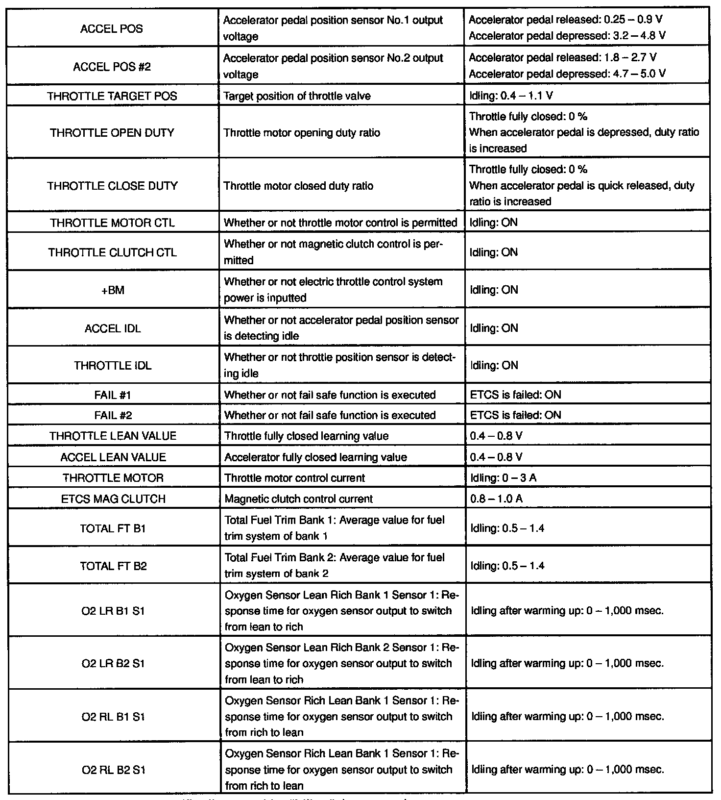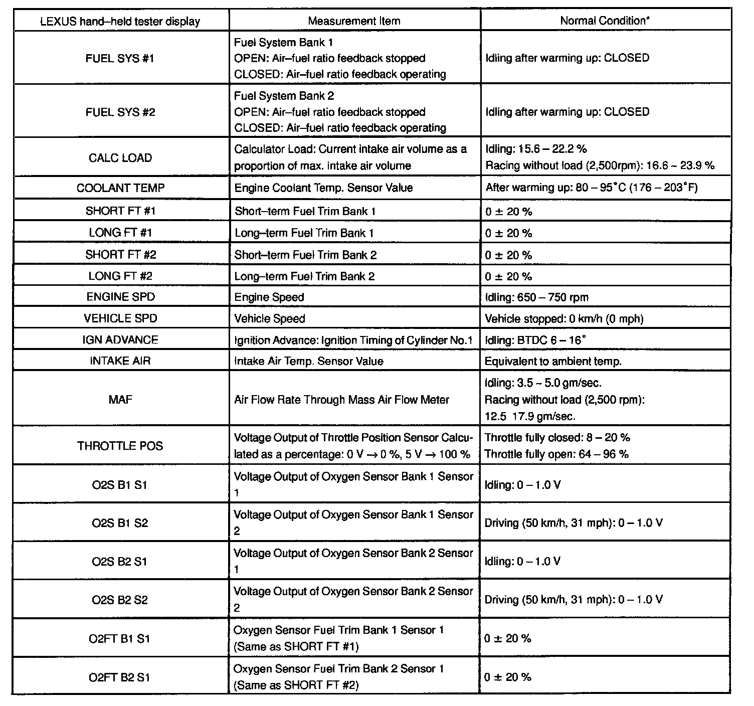NOTE: The values given for "Normal Condition" are representative values, so a vehicle may still be normal even if its value varies differ from those listed here. So do not decide whether a part is faulty or not solely according to the "Normal Condition" here.