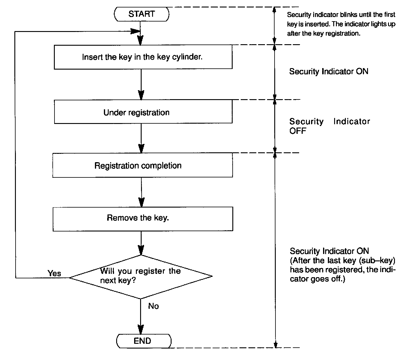 - When a key is not inserted in the key cylinder on the automatic registration mode, the security indicator always lights on.