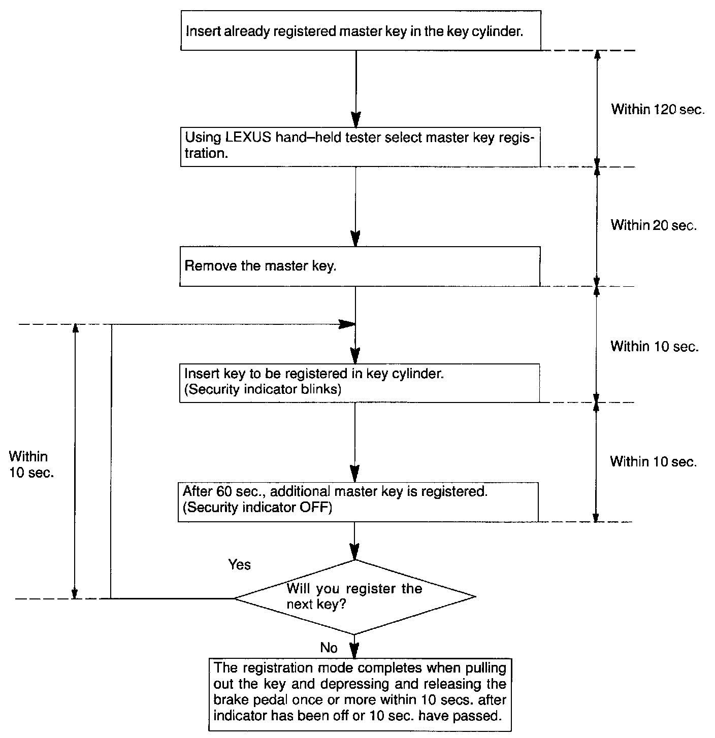 There are 2 ways for registration of additional master key, one way is depressing brake pedal and acceleration pedal and the other way is using LEXUS hand-held tester.