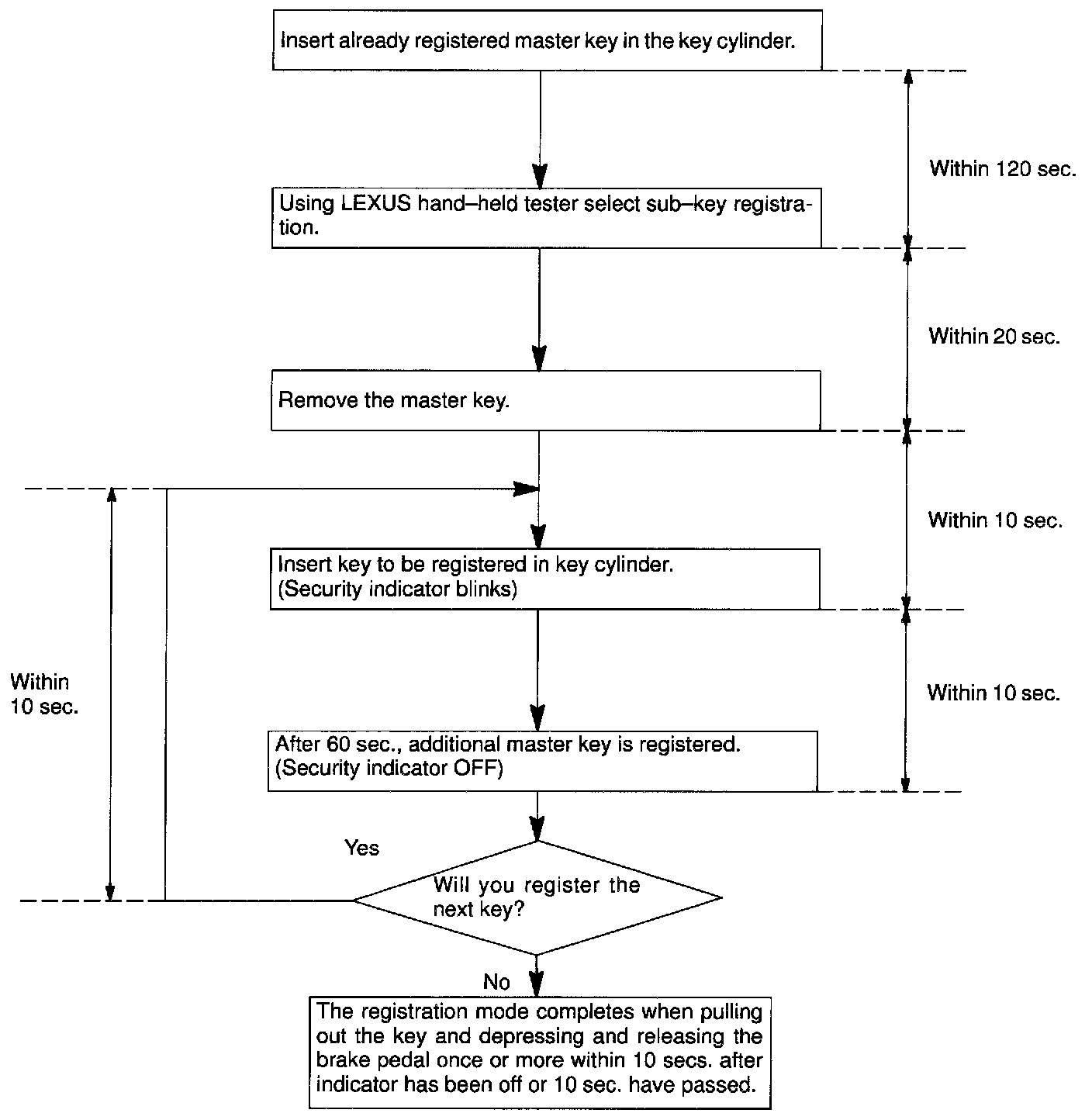There are 2 ways for registration of additional sub-key, one way is depressing brake pedal and acceleration pedal and the other way is using LEXUS hand-held tester.