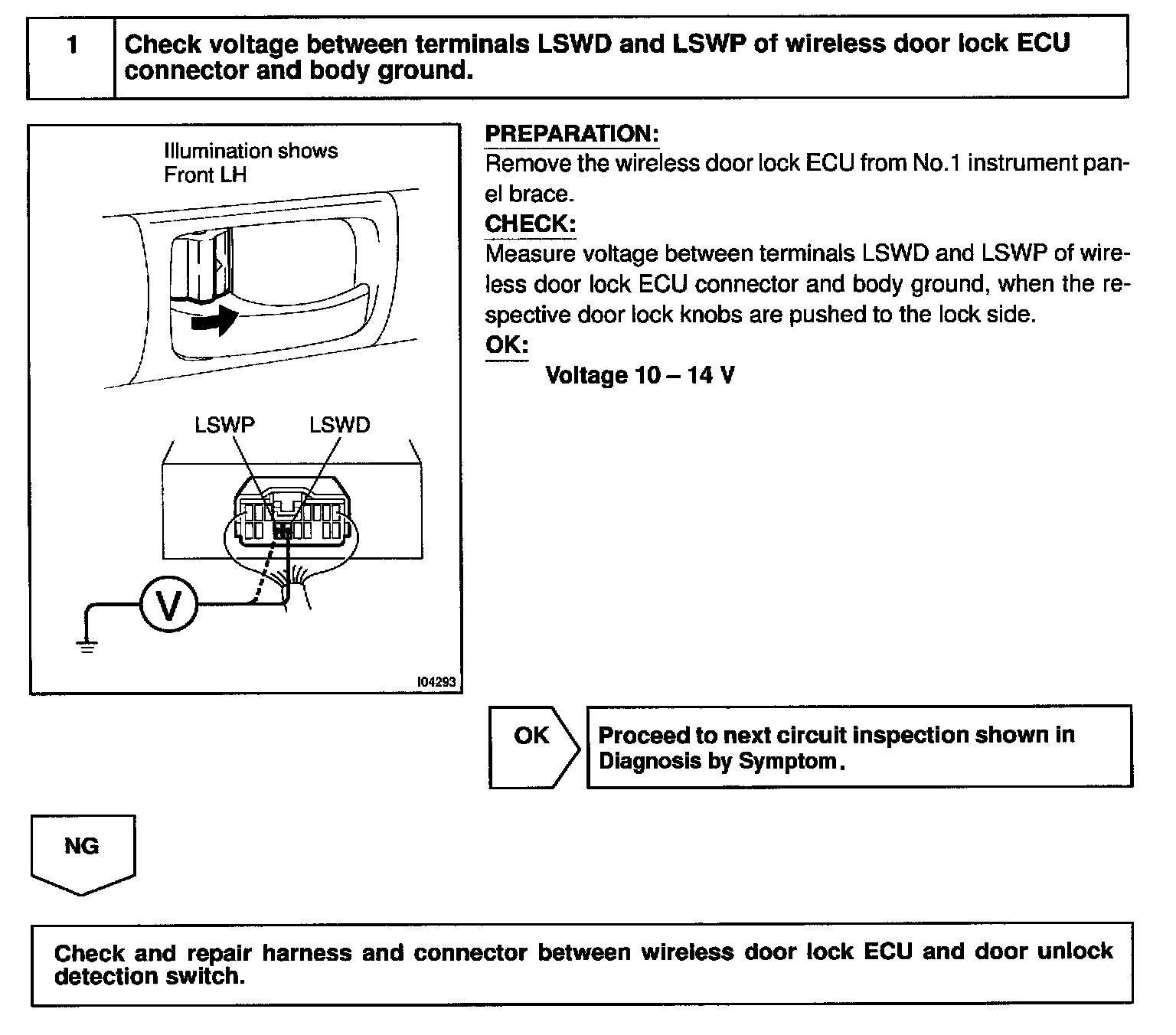 Furthermore, the door unlock detection switch circuit has terminal +B connected inside the theft deterrent ECU, when the door unlock detection switch is OFF, battery positive voltage is applied to the terminal of the door unlock detection switch circuit of the wireless door lock ECU.