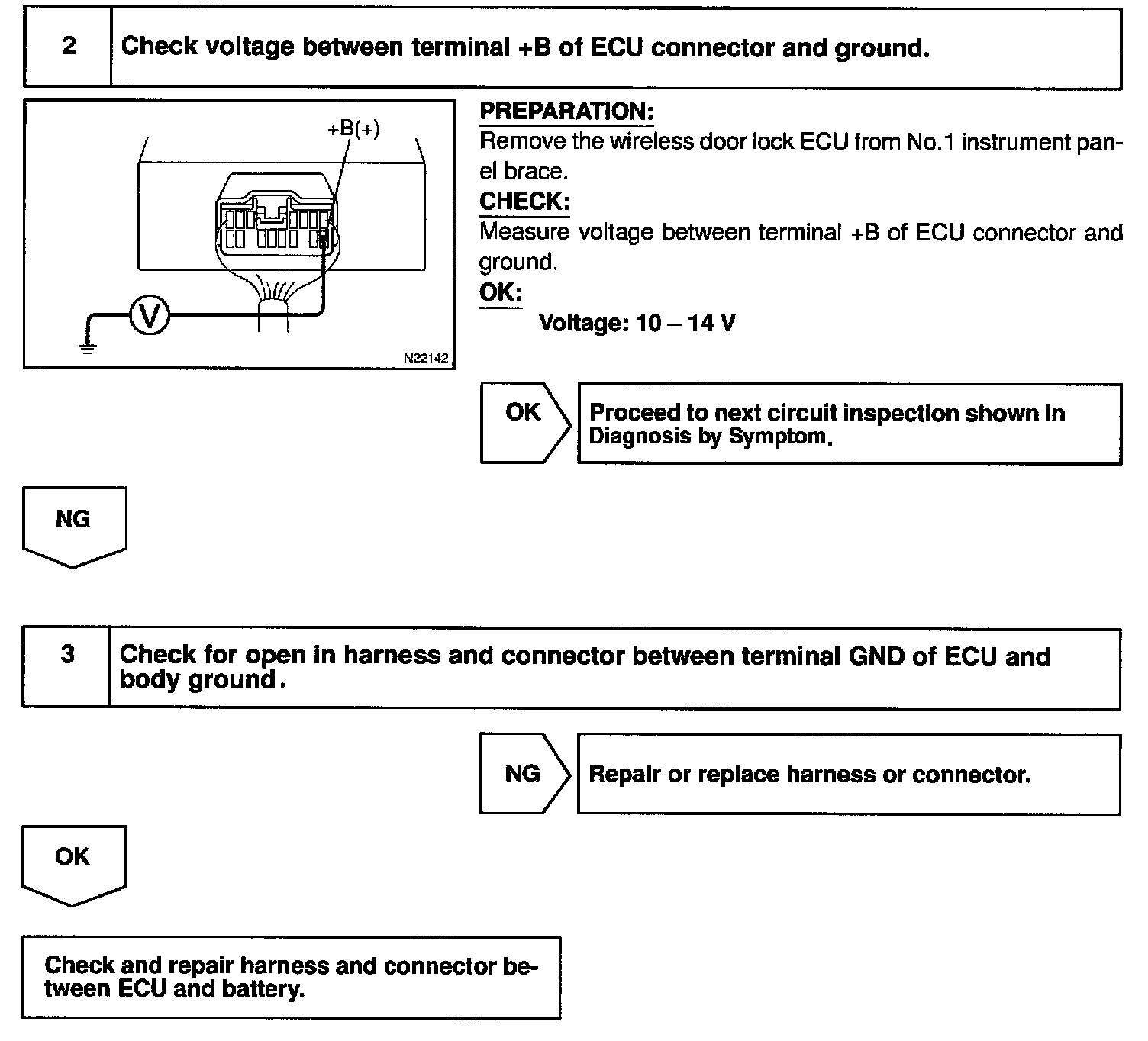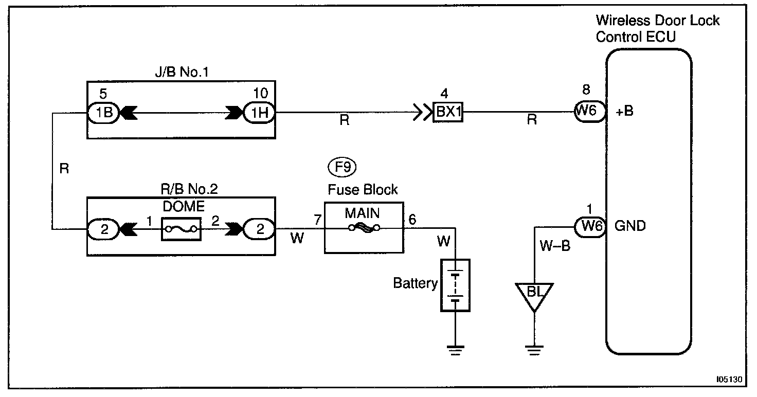 Battery positive voltage is always applied to the terminal +B of the wireless door lock ECU.