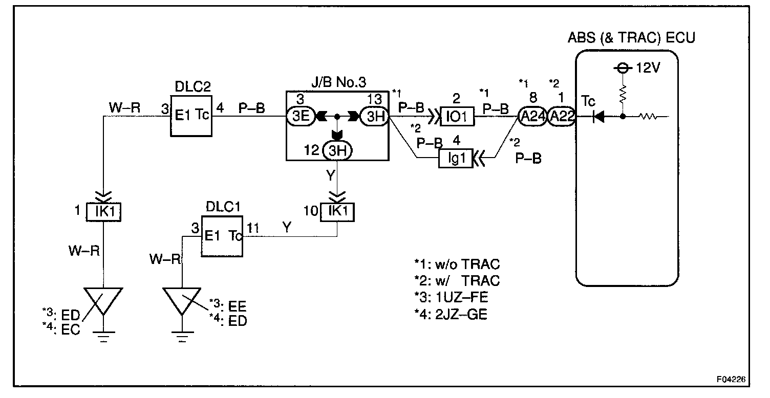 Connecting terminals Tc and E1 of the DLC1 or DLC2 causes the ECU to display the DTC by flashing the ABS warning light.