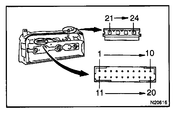 Connect the positive (+) lead from the battery terminal 21 and negative (-) terminal lead to 24 and then check that the illumination lights up.