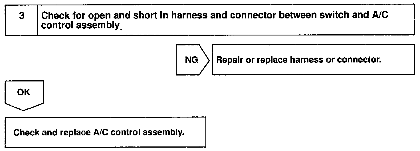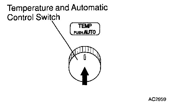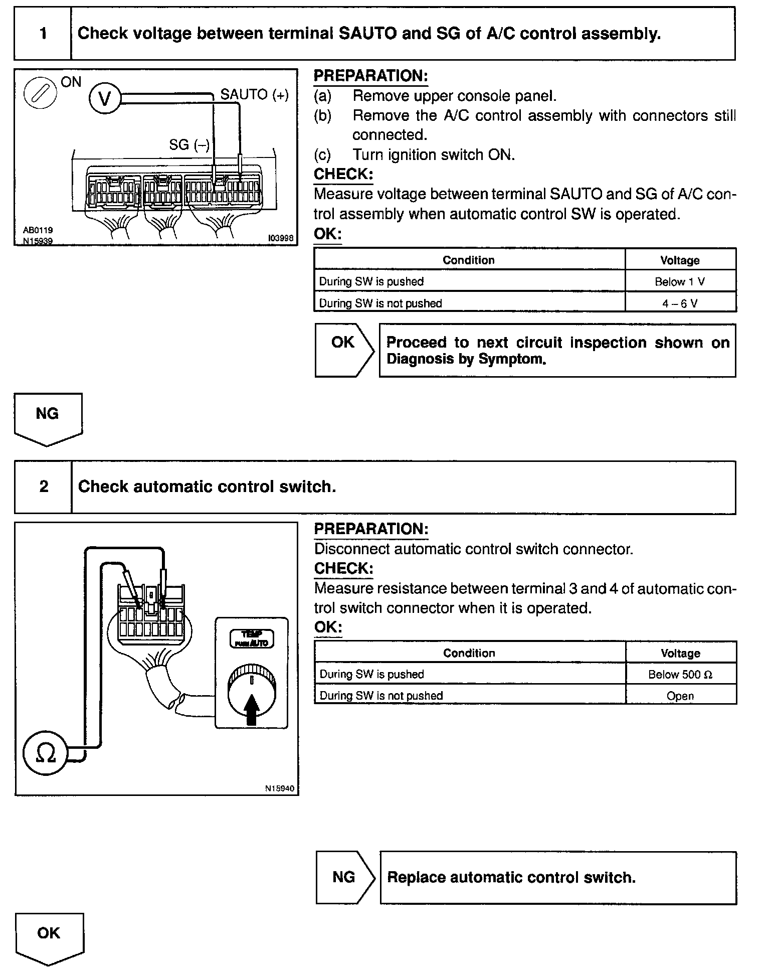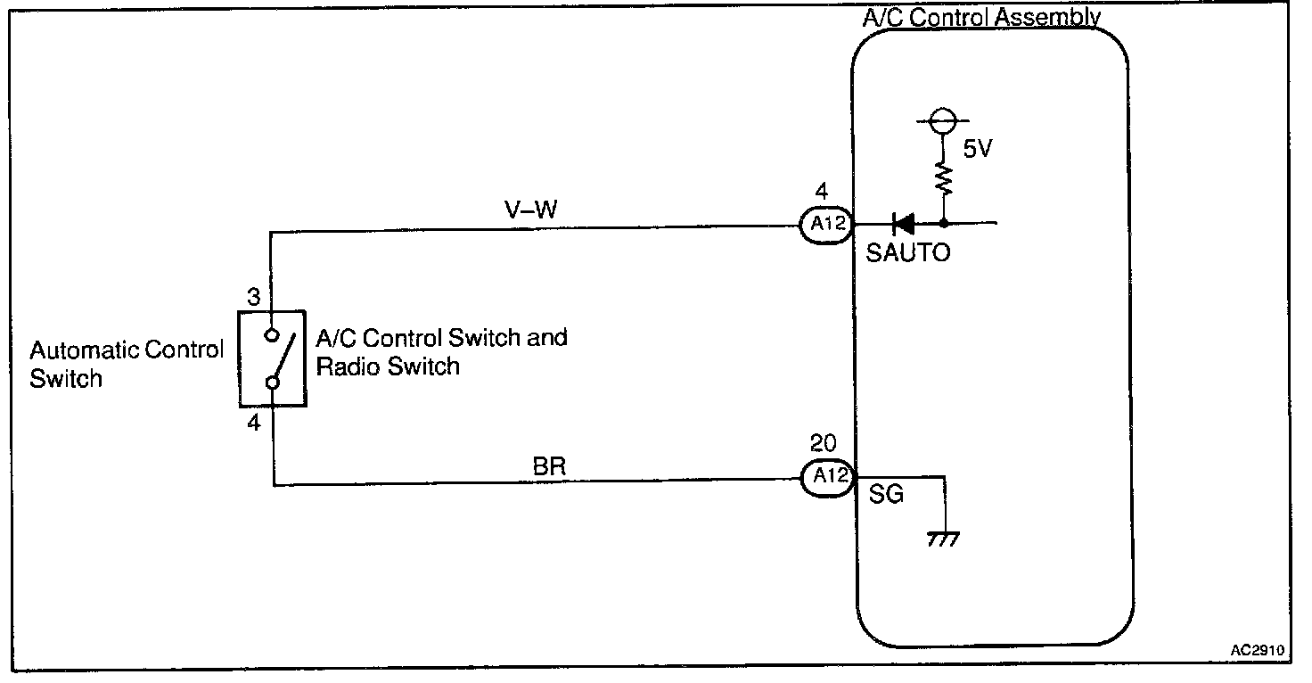 The SW contact is ON while the automatic control SW is pushed, and turns OFF when automatic control SW is released. When the SW is turned ON, the voltage at the SAUTO terminal of A/C control assembly is almost 0 V and the ECU begins fully automatic control of the blower speed, air inlet, air outlet and compressor operation.