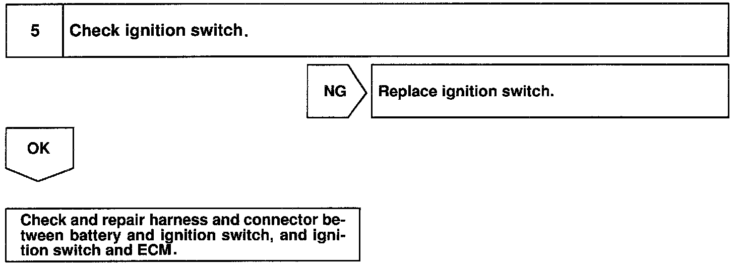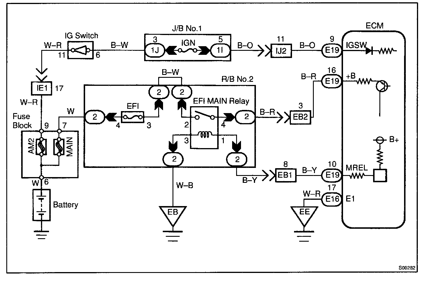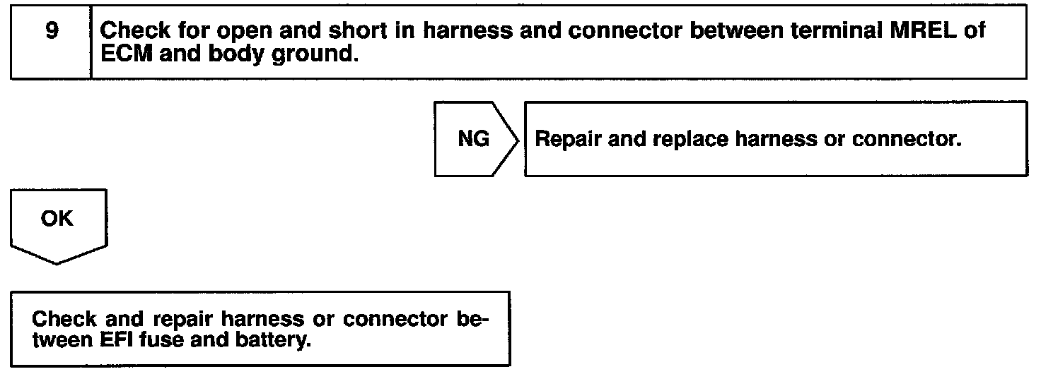 When the ignition switch is turned ON, battery positive voltage is applied to terminal IGSW of the ECM and the EFI main relay control circuit in the ECM sends a signal to terminal MREL of the ECM switching on the EFI main relay.