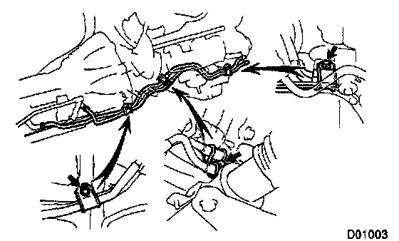 c. Disconnect the 3 wire harness clamps from the bracket on transmission.