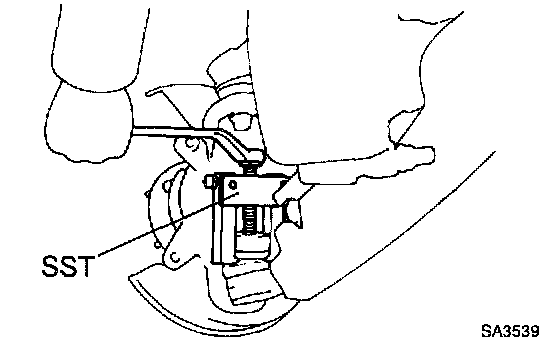 b. Using SST, disconnect the lower suspension arms from the steering knuckles.
