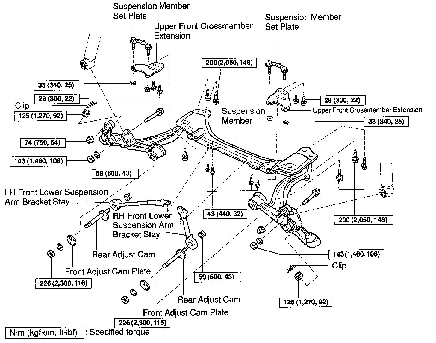 b. Remove the LH and RH upper front crossmember extensions and suspension member set plates.