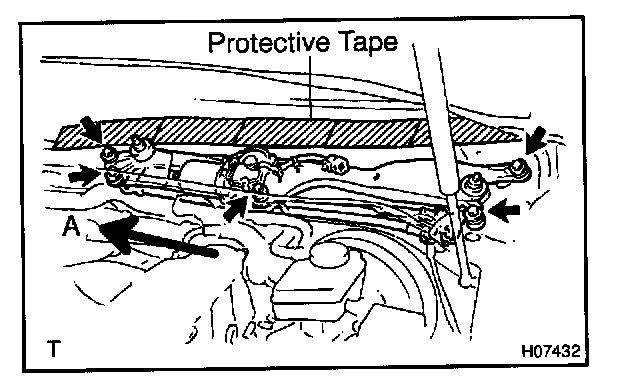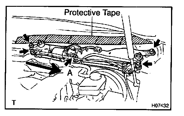 d. Unfasten the 5 bolts, then slip the wiper motor and link assembly in the direction shown by the arrow A, lift up the back part and remove the wiper motor and link assembly.