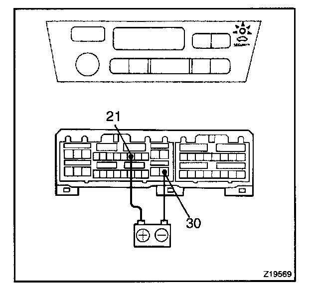 Connect the positive (+) lead from the battery to terminal 21 and negative (-) lead to terminal 30, then check that the indicator light up.