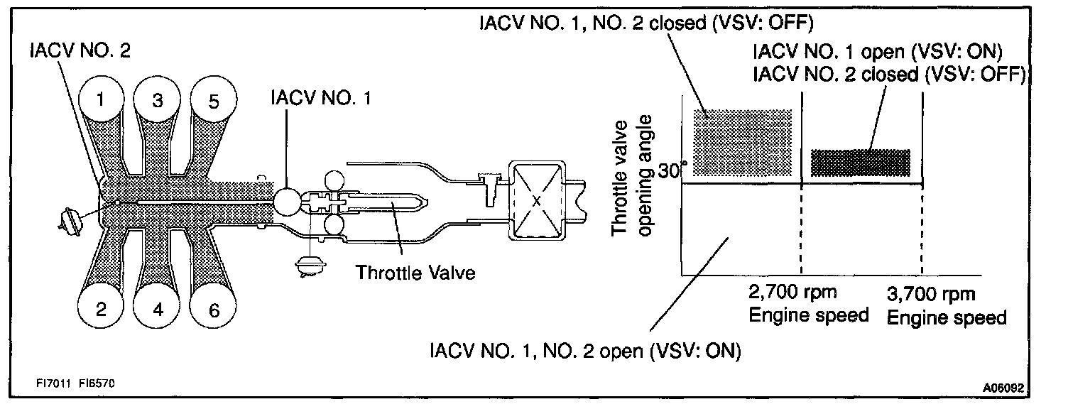 When the engine speed is 3,700 rpm or less and the throttle valve opening angle is 30° or more, the ECM turns the two VSV ON or OFF and operate the IACV.