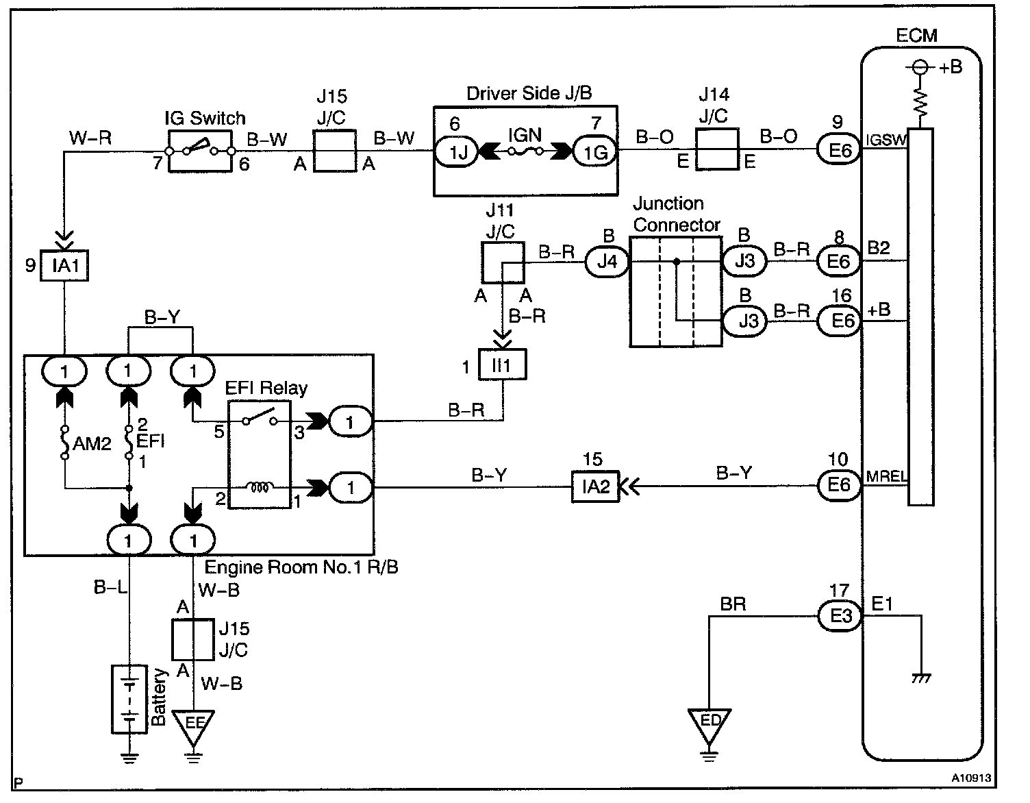 This signal causes current to flow to the coil, closing the contacts of the EFI main relay and supplying power to terminals +B and B2 of the ECM.
