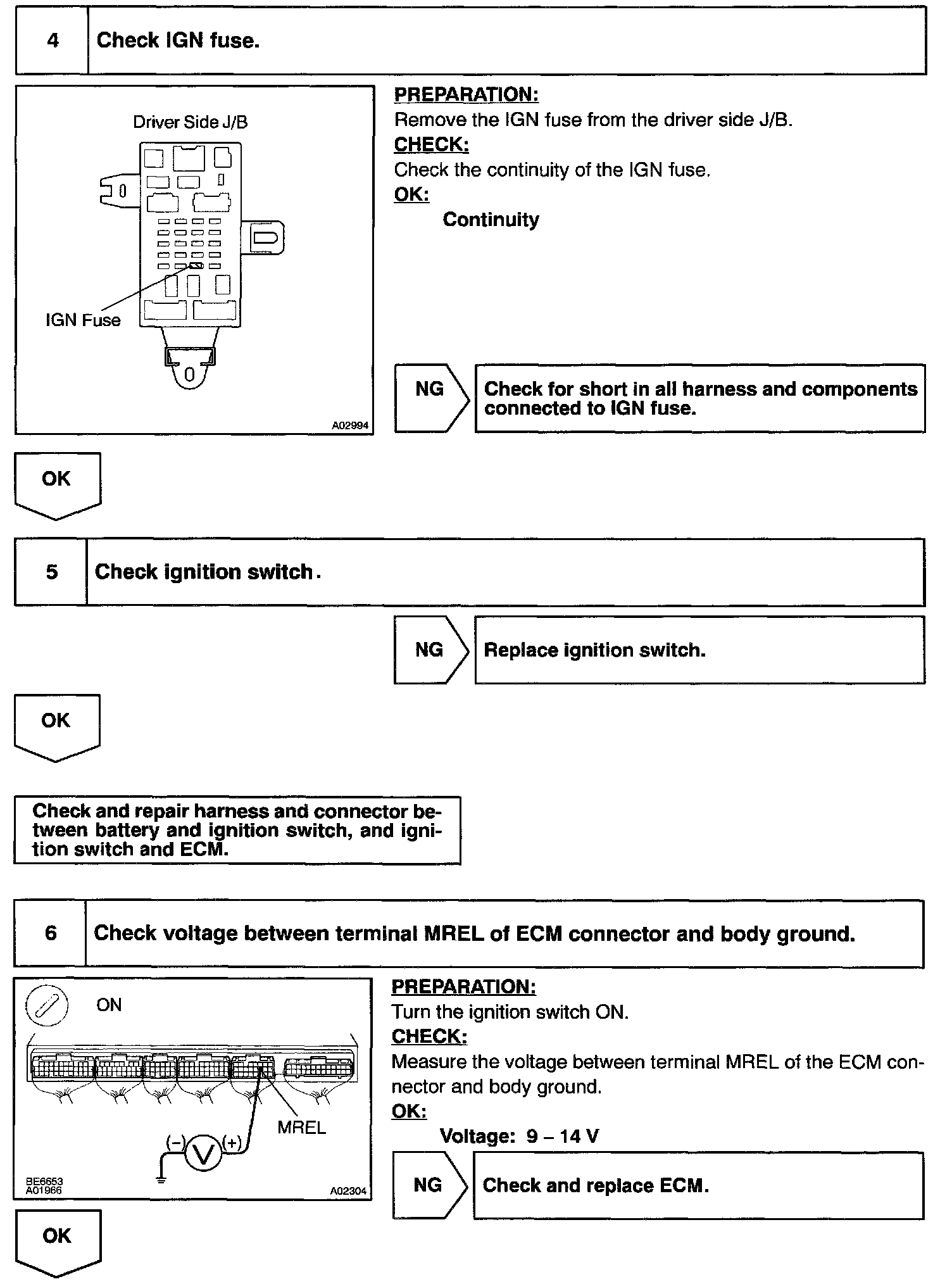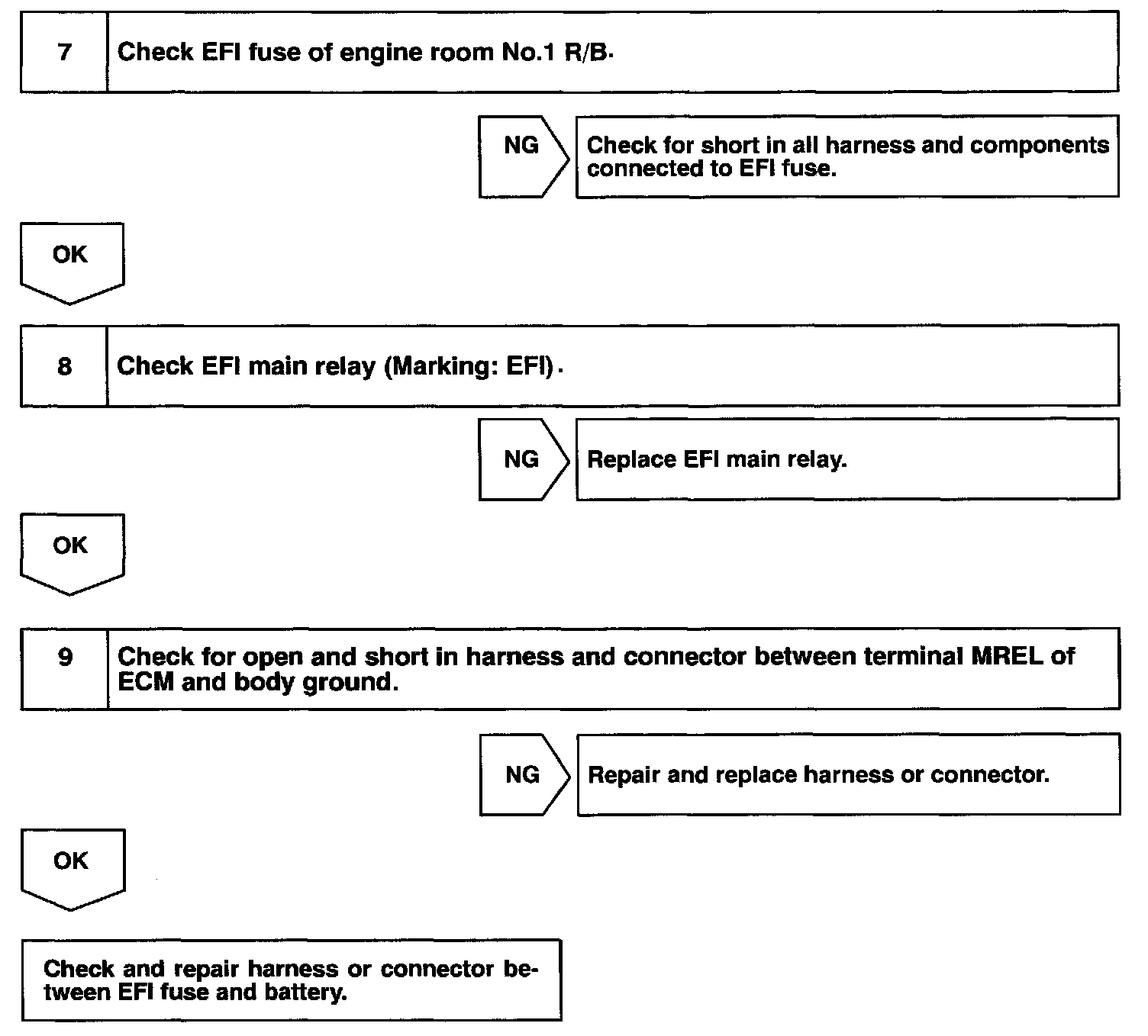 When the ignition switch is turned ON, battery positive voltage is applied to terminal IGSW of the ECM and the EFI main relay (Marking: EFI) control circuit in the ECM sends a signal to terminal MREL of the ECM switching on the EFI main relay.