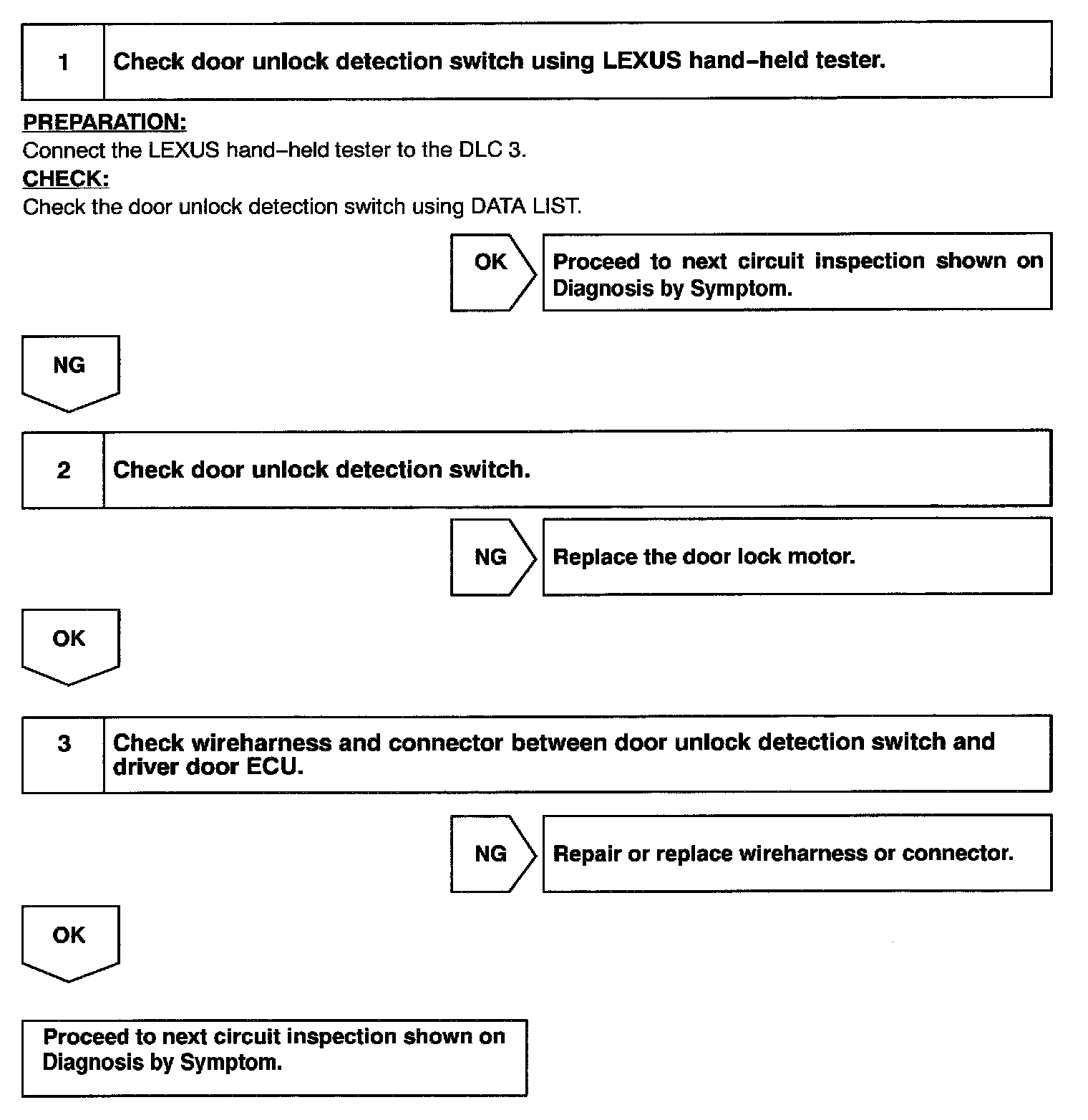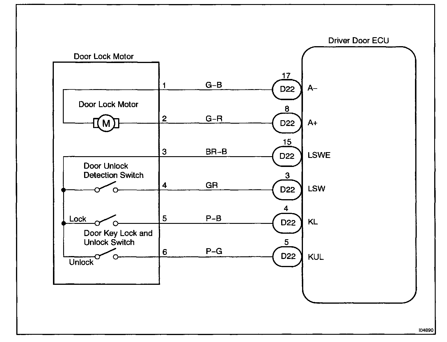 The door unlock detection switch is built in the door lock motor assembly. This switch is ON when the door lock knob is in the unlock position and OFF when the lock knob is in the lock position. The ECU detects the door lock knob conditions is this circuit. It is used as one of the operating conditions for the key confinement prevention function.