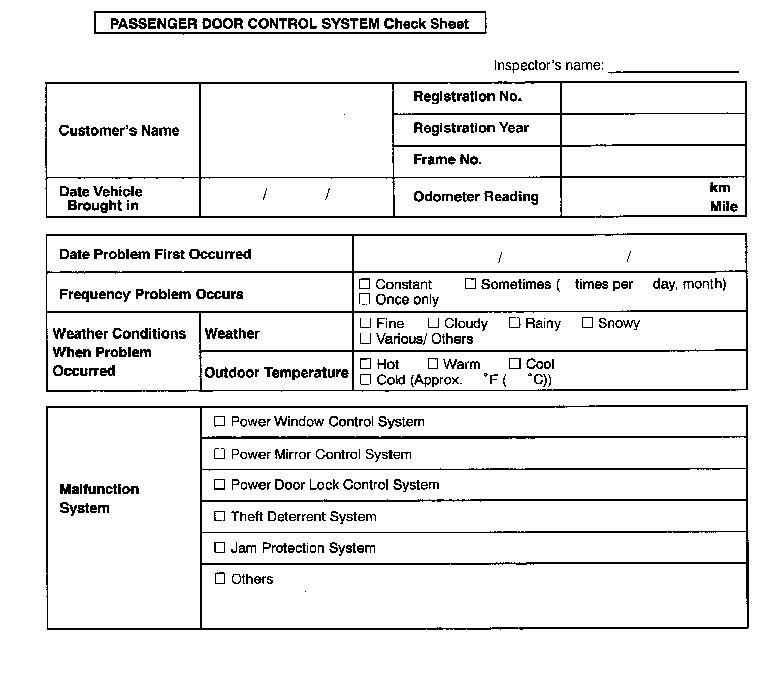 Passenger Door Control System Check Sheet: