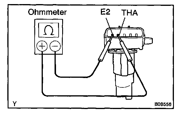 Using an ohmmeter, measure the resistance between terminals THA and E2.