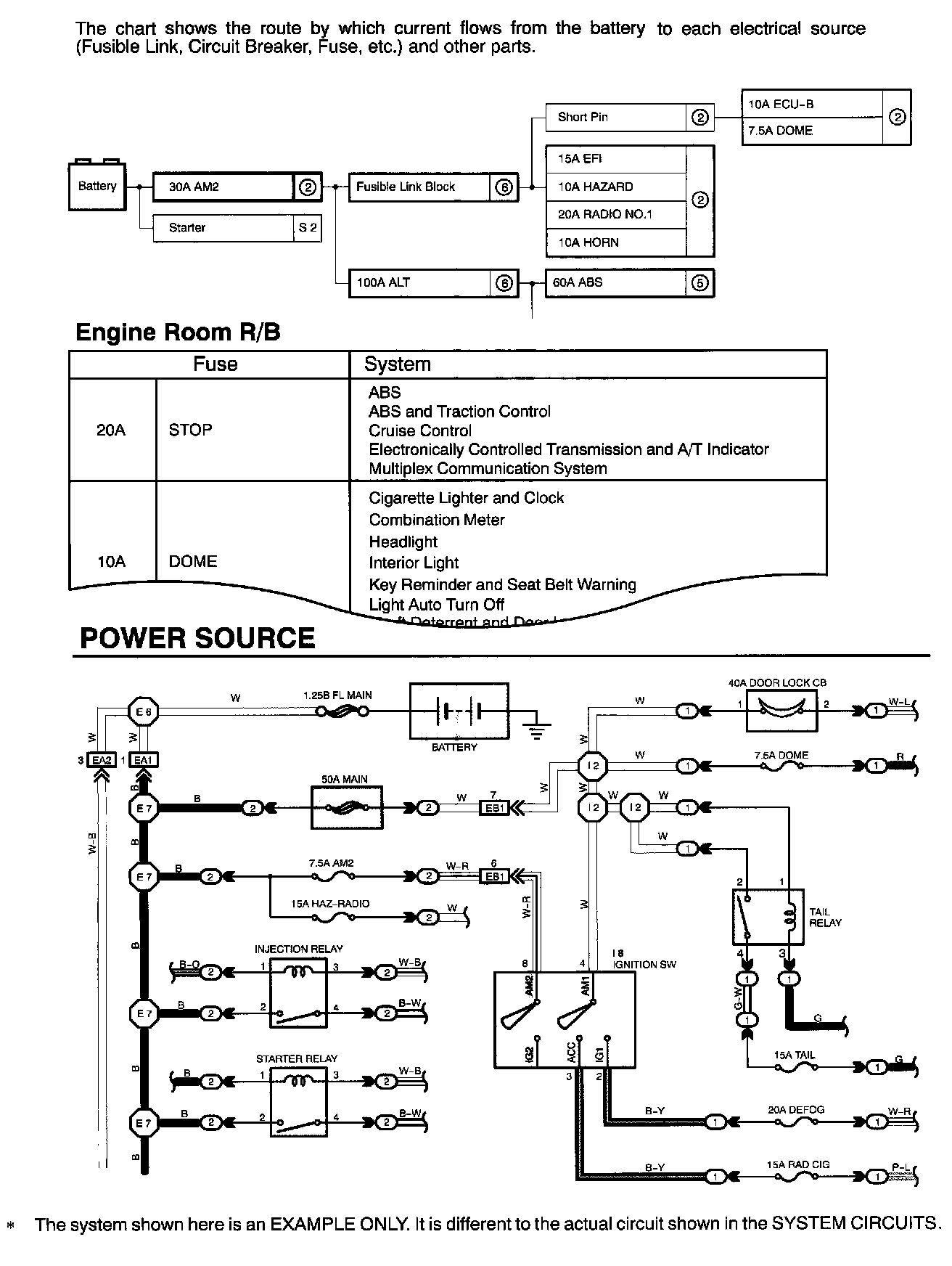 HOW TO READ POWER SOURCEThe "Current Flow Chart" section, describes which parts each power source (fuses, fusible links, and circuit breakers) transmits current to. In the Power Source circuit diagram, the conditions when battery power is supplied to each system are explained. Since all System Circuit diagrams start from the power source, the power source system must be fully understood.