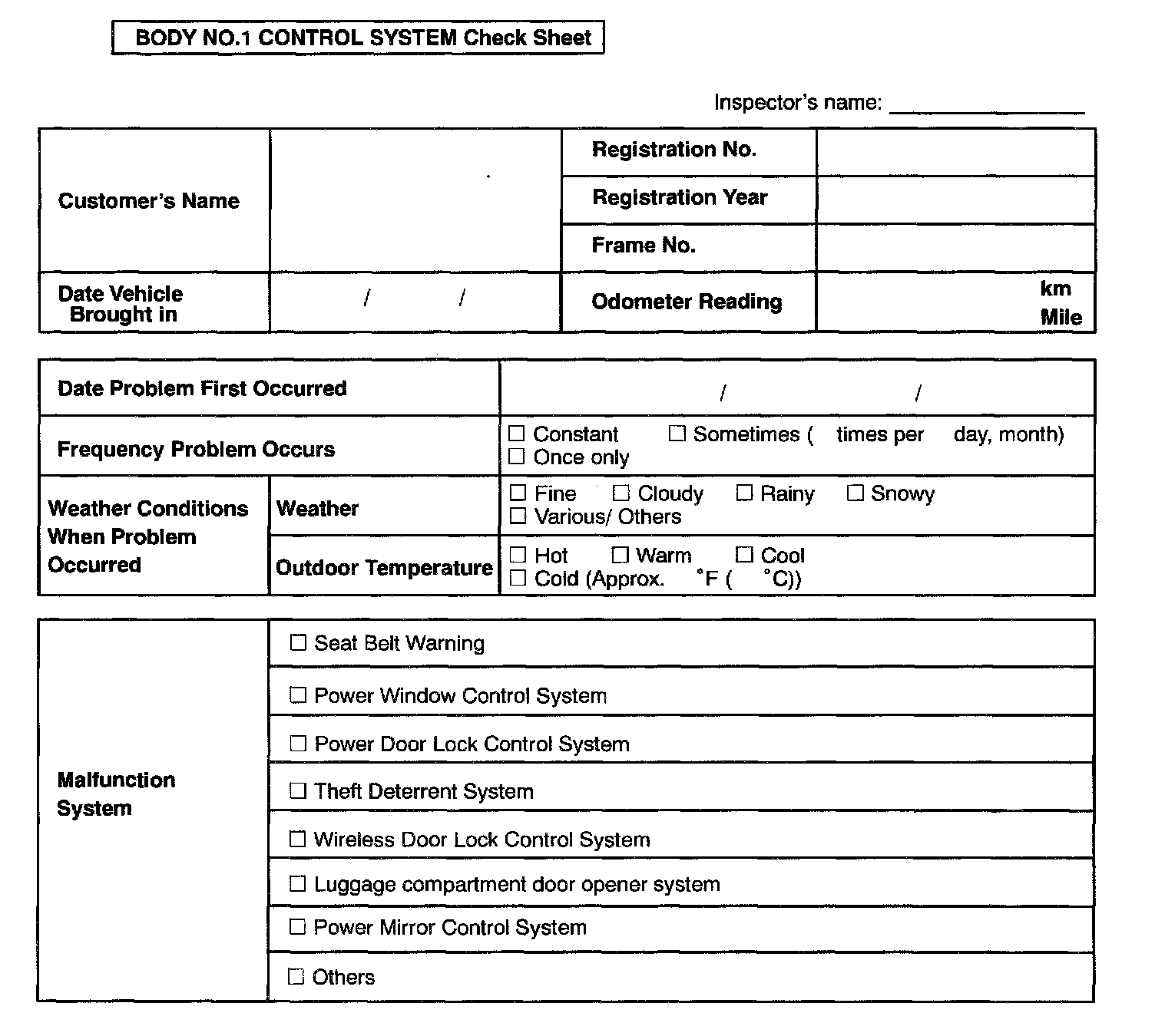 Body No.1 Control System Check Sheet: