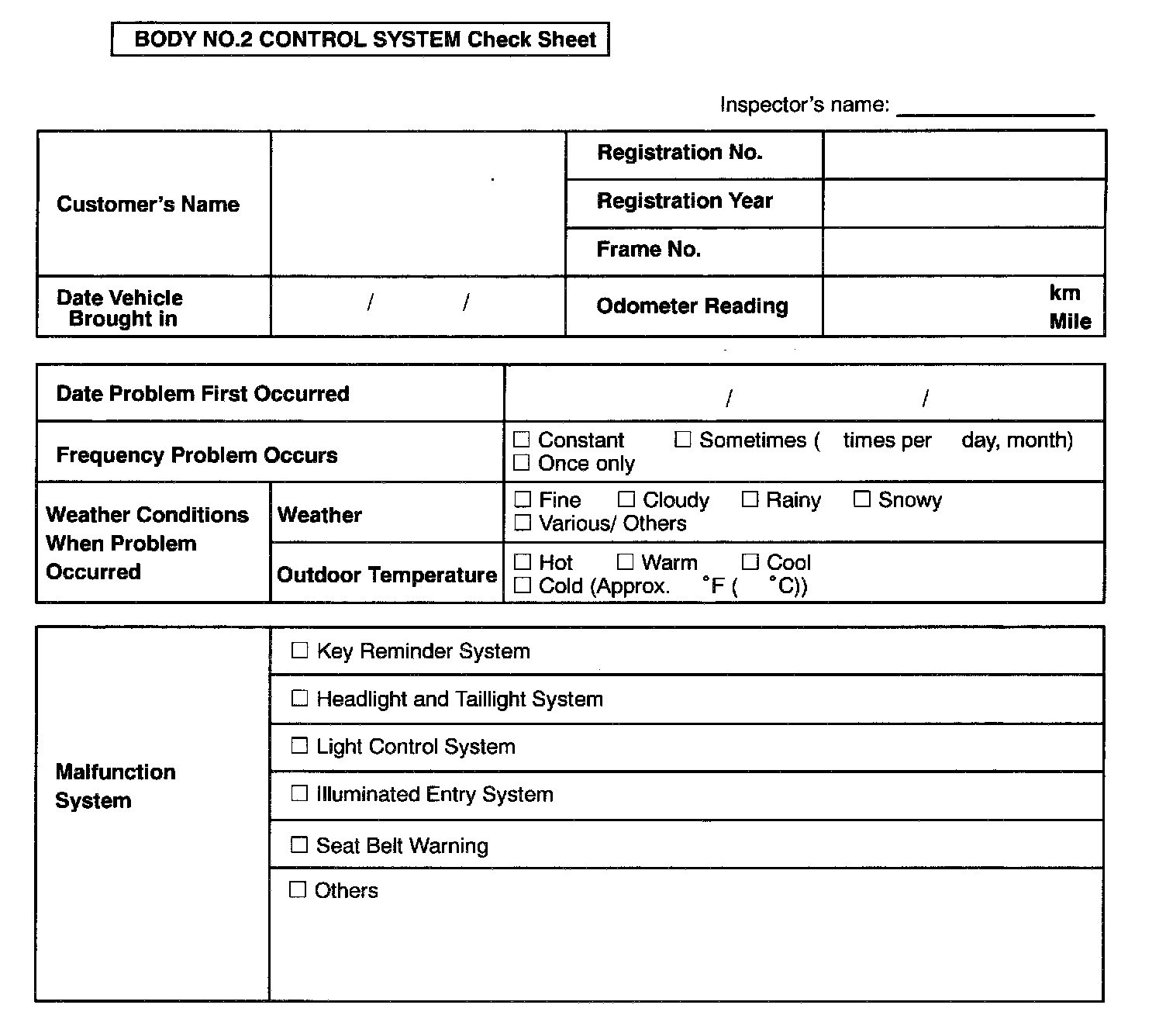 Body No.2 Control System Check Sheet: