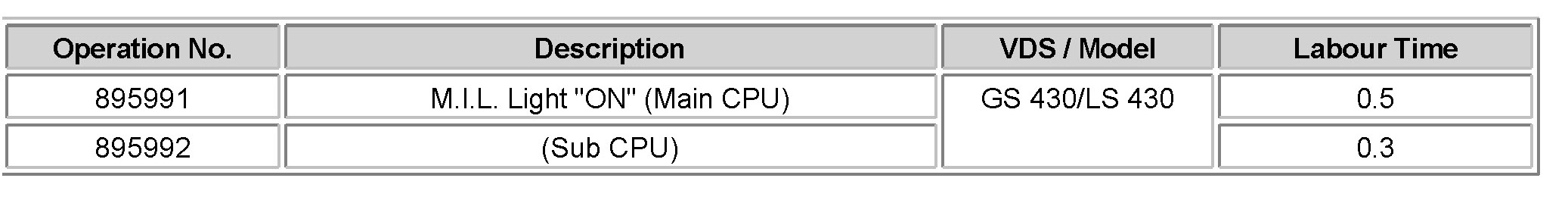 After starting the engine under certain cold operation conditions, some 2001 model year GS 430 and LS 430 vehicles may exhibit M.I.L. "ON" with numbers P0300 through P0308 (random misfire and single cylinder misfire). The Engine Control Module (ECM) calibration files were revised to correct this condition.