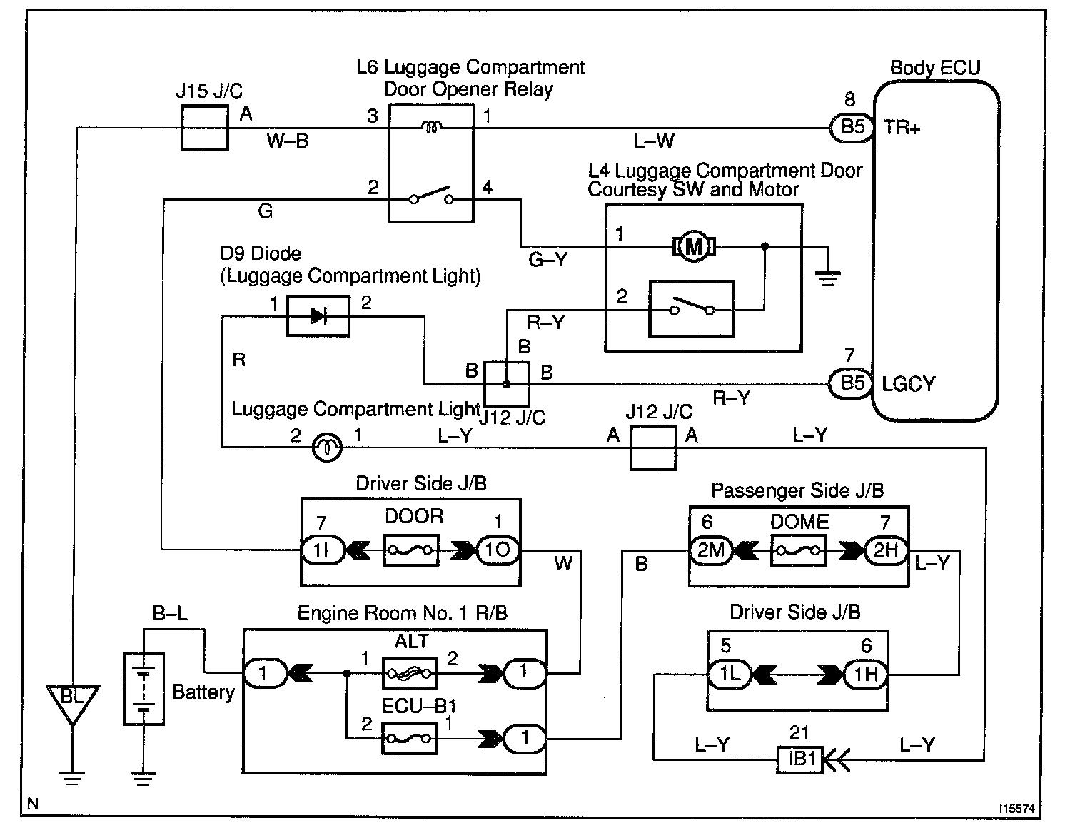 The luggage courtesy switch goes on when luggage compartment door is opened and goes off when luggage compartment door is closed.