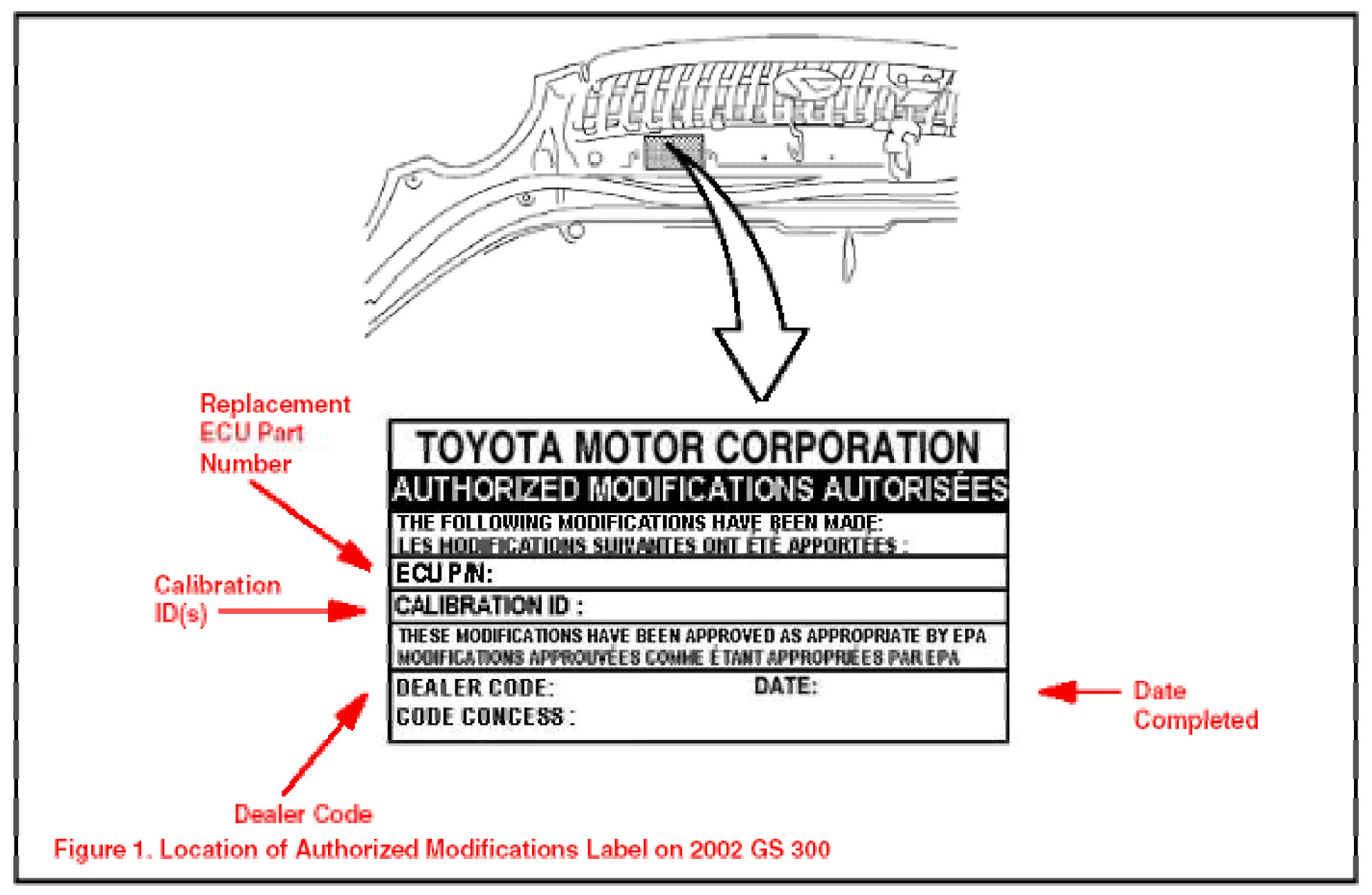 1. Check for the Authorized Modifications Label affixed to the vehicle in the location shown in Figure 1. Confirm if ECM (PCM) calibration has been updated. If not latest ECM (PCM) calibration - go to step 2.