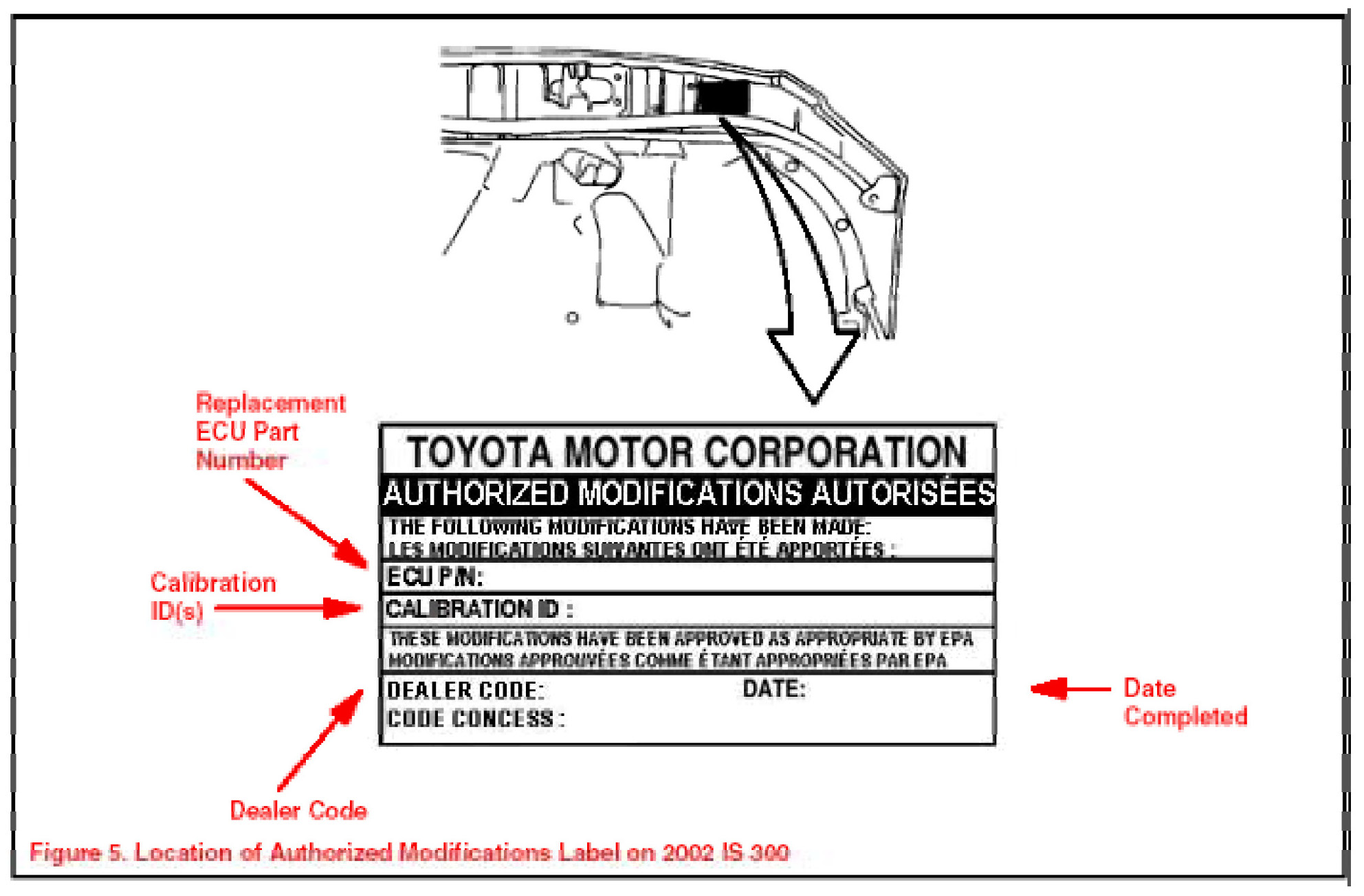 1. Check for the Authorized Modifications Label affixed to the vehicle in the location shown in Figure 5. Confirm if ECM (PCM) calibration has been updated. If not latest ECM (PCM) calibration - go to step 2.
