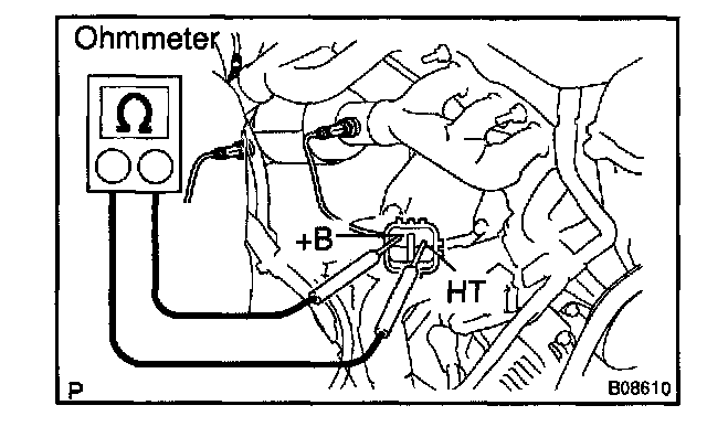 Using an ohmmeter, measure the resistance between the terminals +B and HT.