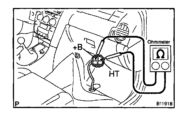 b. Using an ohmmeter, measure the resistance between the terminals +B and HT.