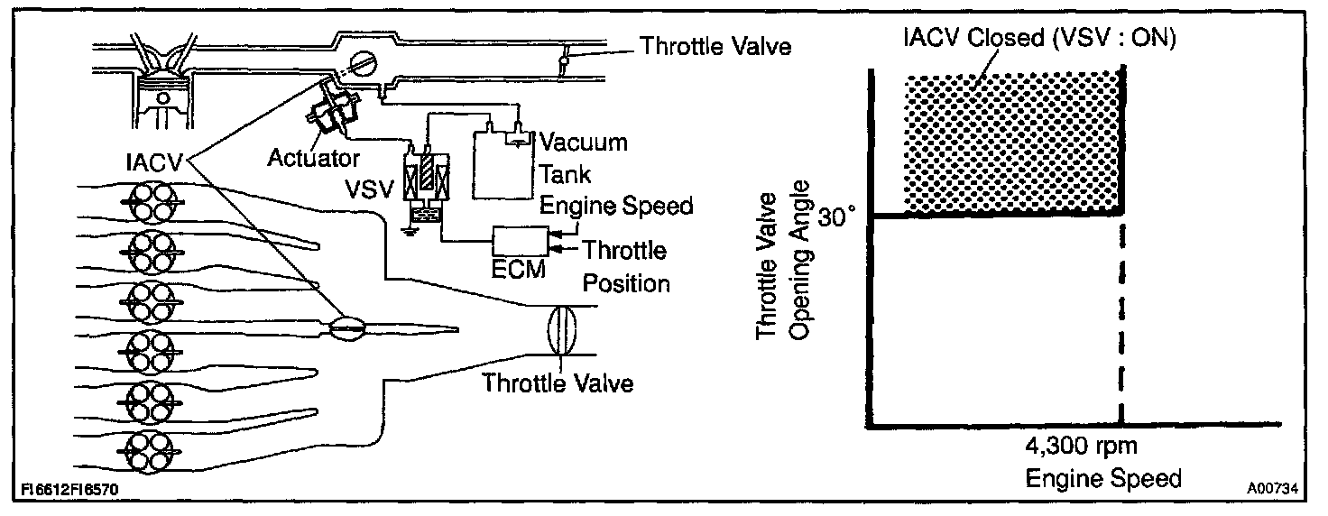When the engine speed is 4,300 rpm or less and the throttle valve opening angle is 30 ° or more, the ECM turns the VSV ON and closes the IACV. At all other times, the VSV is OFF, so the IACV is open.