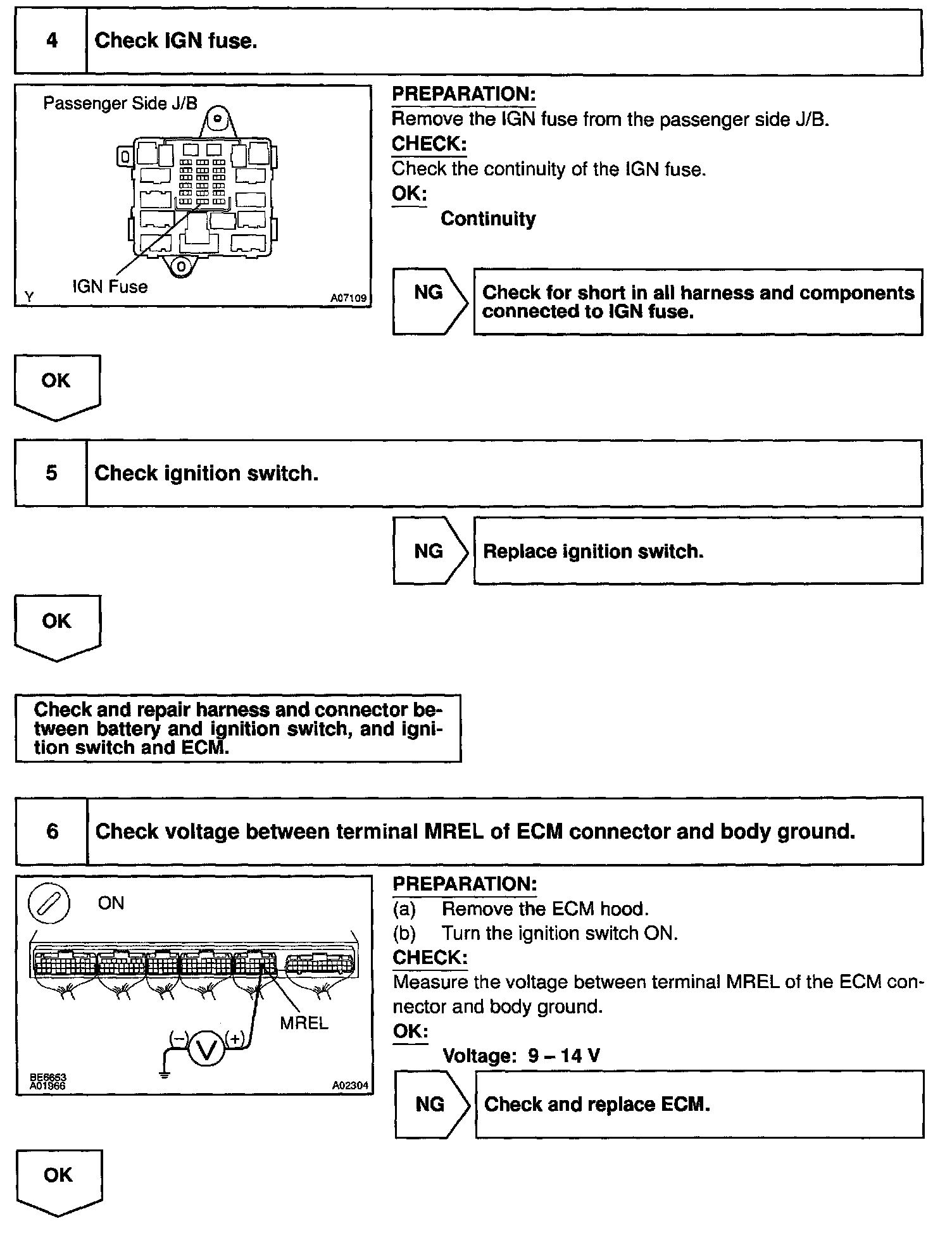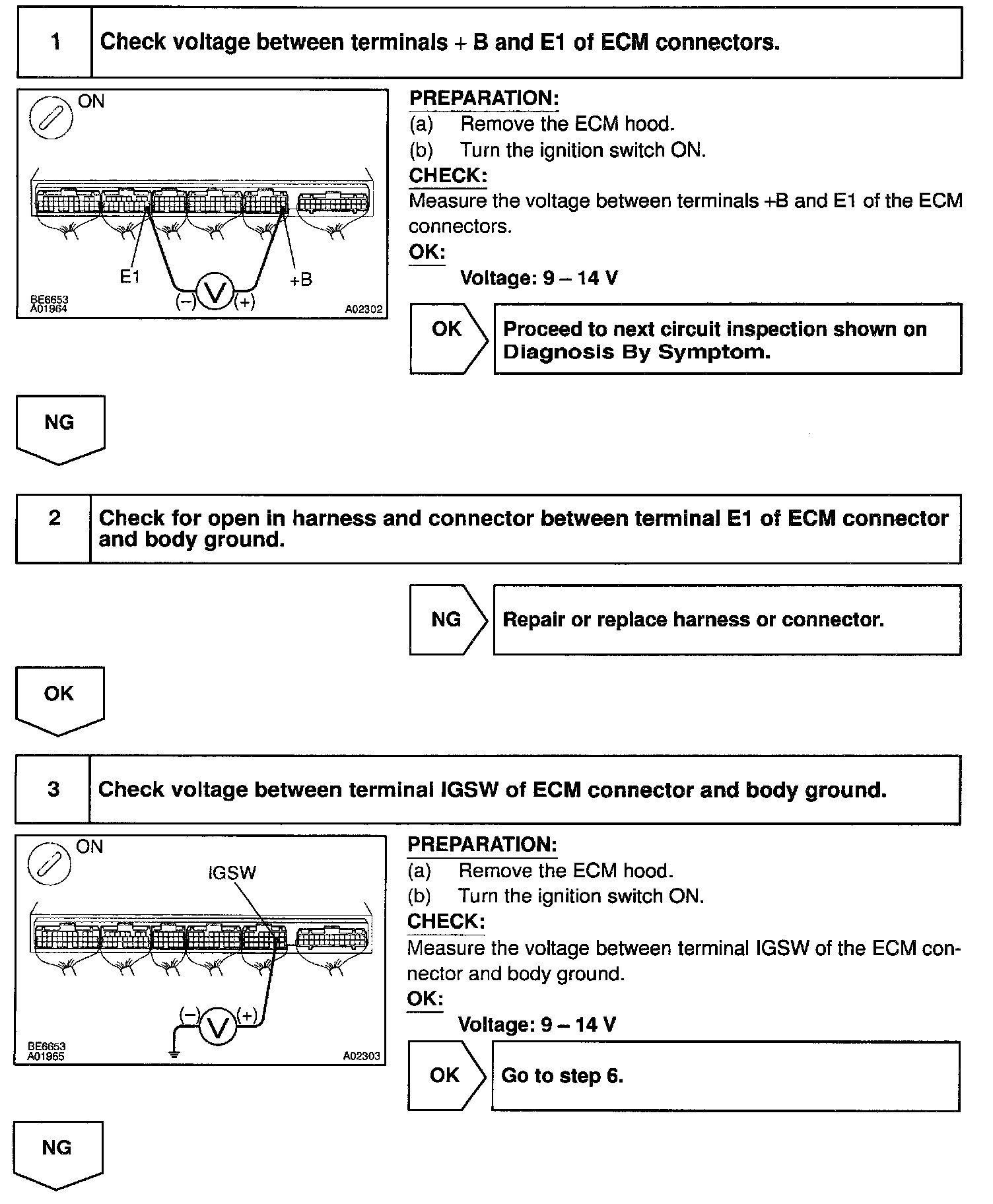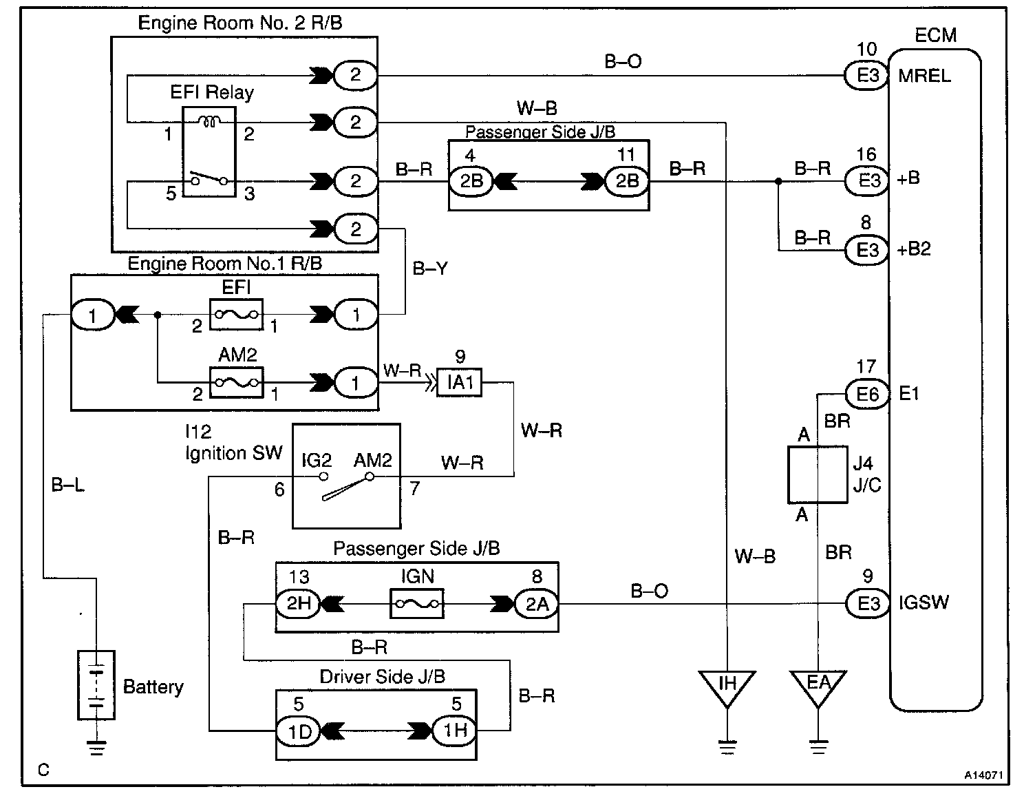 This signal causes current to flow to the coil, closing the contacts of the EFI main relay and supplying power to terminals +B and B2 of the ECM.