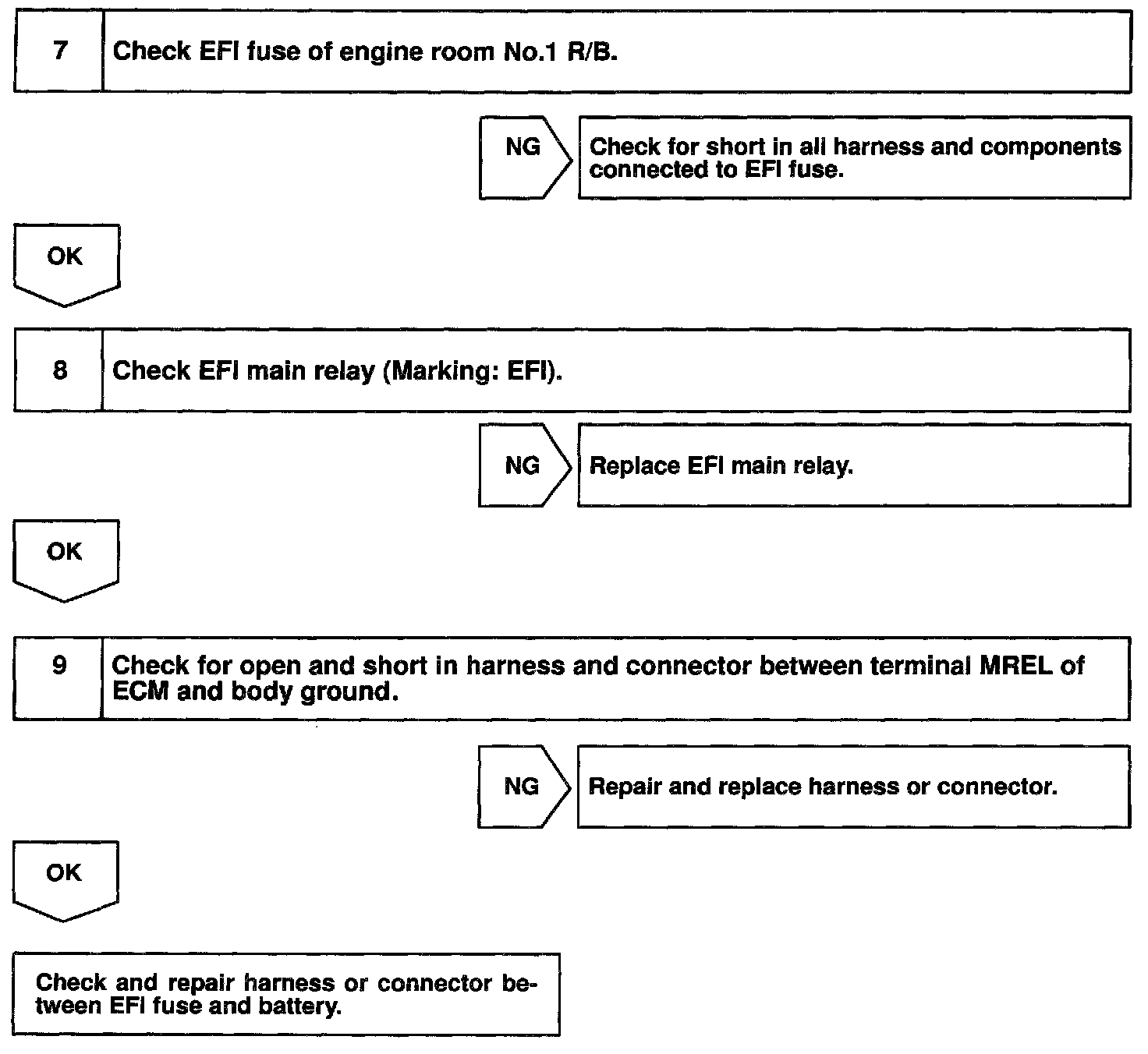 CIRCUIT DESCRIPTIONWhen the ignition switch is turned ON, battery positive voltage is applied to terminal IGSW of the ECM and the EFI main relay (Marking: EFI) control circuit in the ECM sends a signal to terminal MREL of the ECM switching on the EFI main relay.