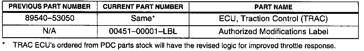 To improve throttle response and 5-2 downshift time, the Engine Control Module (ECM) calibration has been revised and the TRAC ECU has been changed.