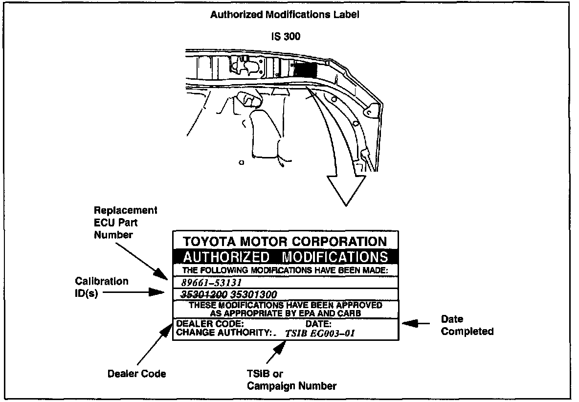 After flash reprogramming the ECM, enter the required information on the Authorized Modifications Label and affix it to the vehicle at the location shown.