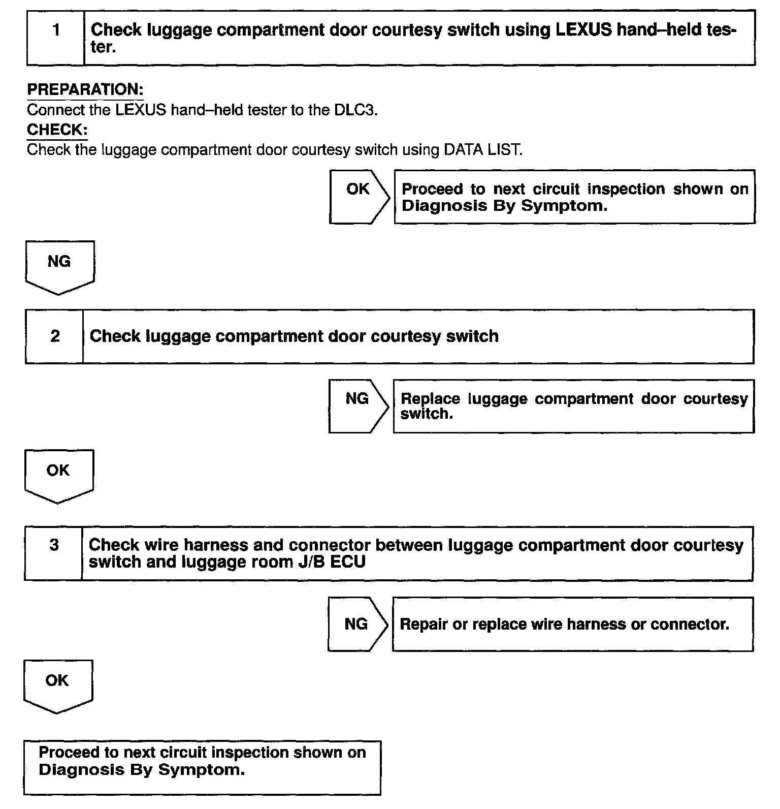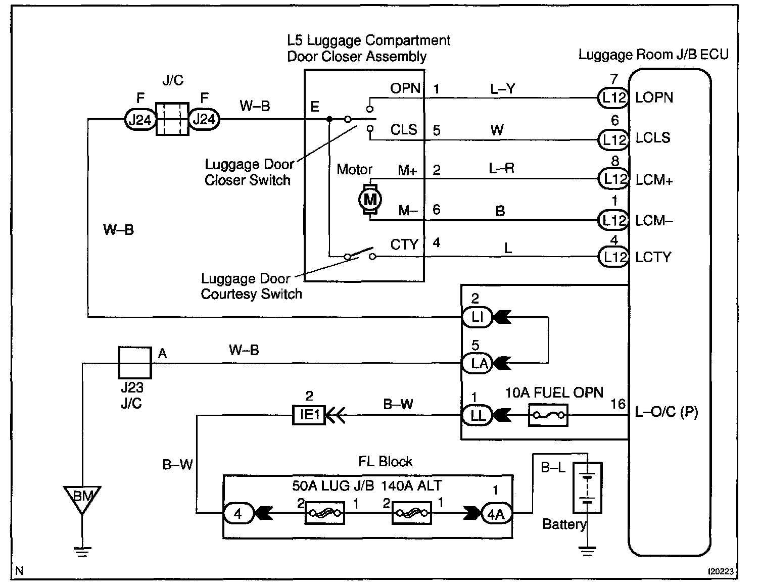 CIRCUIT DESCRIPTIONThe Luggage Door switch (LOPN, LCLS), which check the position of the luggage closer, and the Luggage Door Courtesy SW (LCTY), which checks the condition of the luggage, are installed in the luggage door lock assembly. The Luggage Door Lock switch (BDCY), which also checks the condition of the luggage is related to the operation of the luggage door.