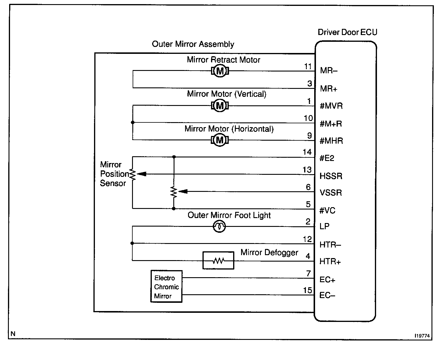 CIRCUIT DESCRIPTIONThis mirror position sensor is built in the outer mirror assembly.