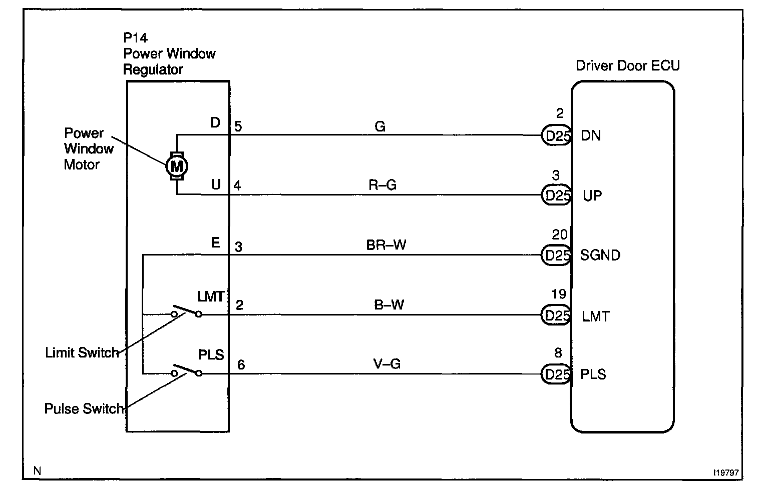 CIRCUIT DESCRIPTIONThe Driver Door ECU receives the driver door power window switch signal from the master switch to operate the power window motor.
