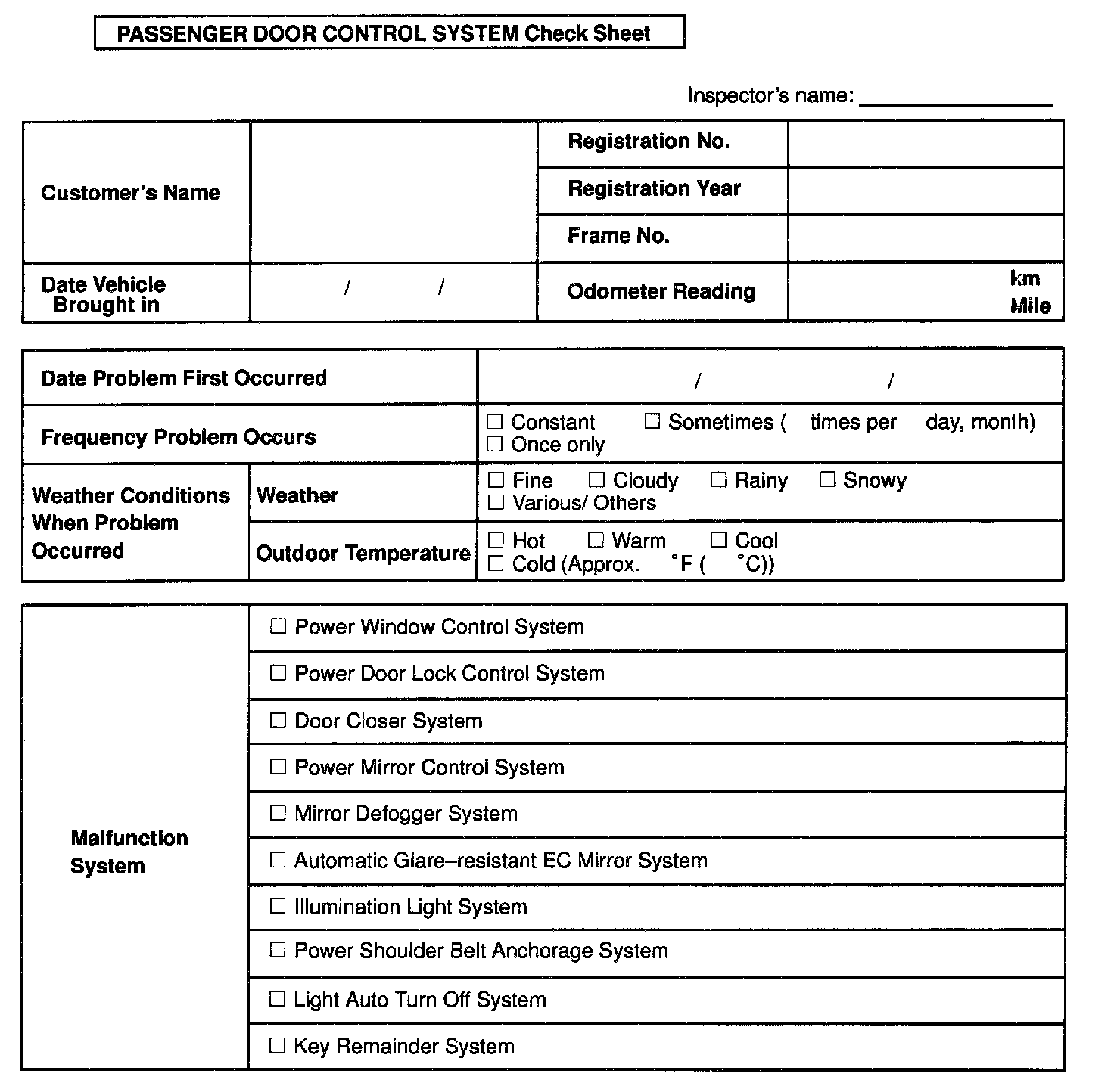 Passenger Door Control System Check Sheet: